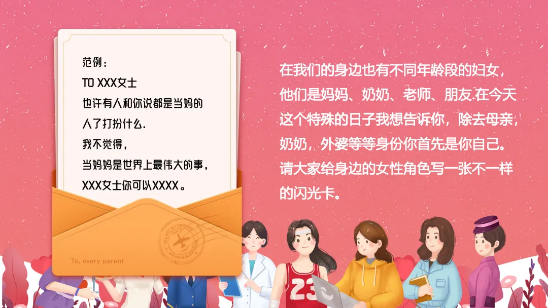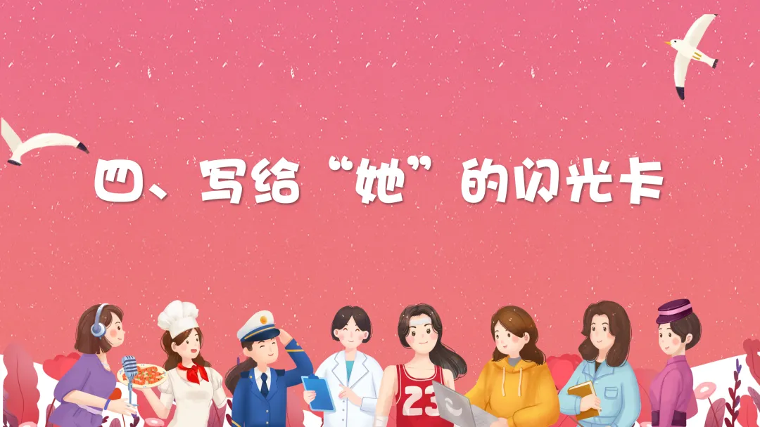 设计意图 | 妇女节的由来:通过视频和讨论,让学生了解妇女节的历史背景和意义,增强对女性权益的认同感。 了不起的她:通过介绍不同领域的杰出女性,让学生感受到女性的伟大与力量,激发学生对女性的敬佩之情,同时引导学生学习她们的优秀品质。 她本来就很美:通过提问和讨论,打破学生对“妇女”和“美”的刻板印象,引导学生树立正确的审美观和价值观,认识到女性的美是多元的、独特的。 写给她的闪光卡:通过实践活动,让学生关注身边的女性,表达对她们的尊重和爱,增强学生的感恩意识和情感表达能力。 | ||