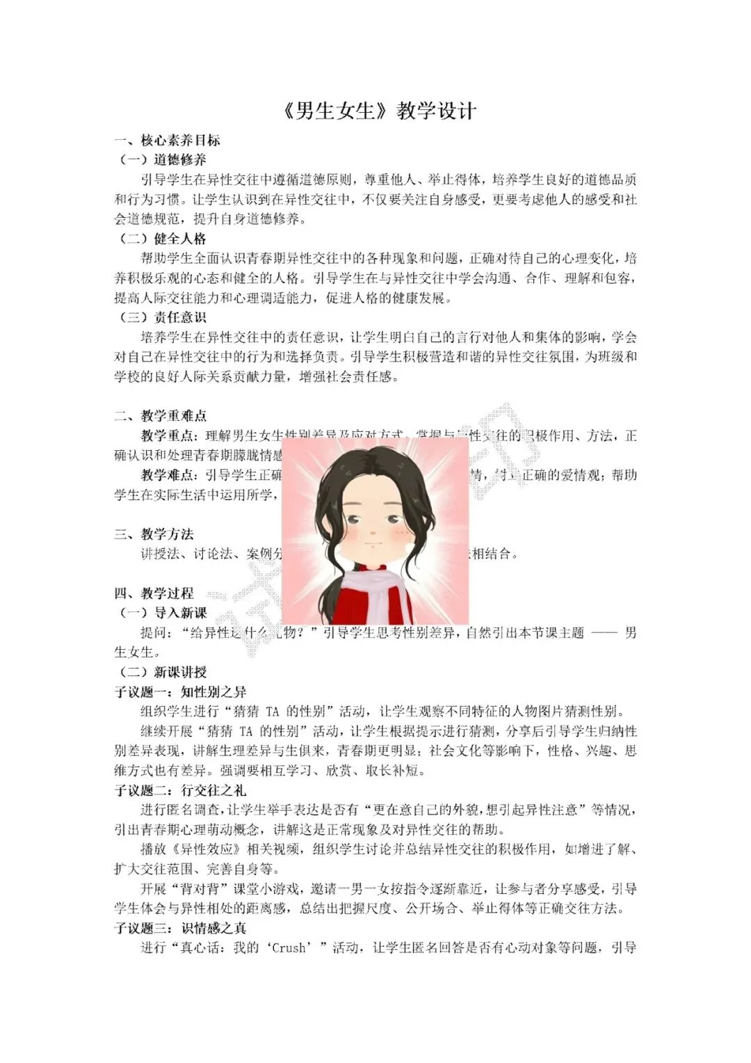 (一)导入新课。提问:“给异性送什么礼物?”引导学生思考性别差异,自然引出本节课主题 —— 男生女生。(二)新课讲授。子议题一:知性别之异;子议题二:行交往之礼;子议题三:识情感之真。