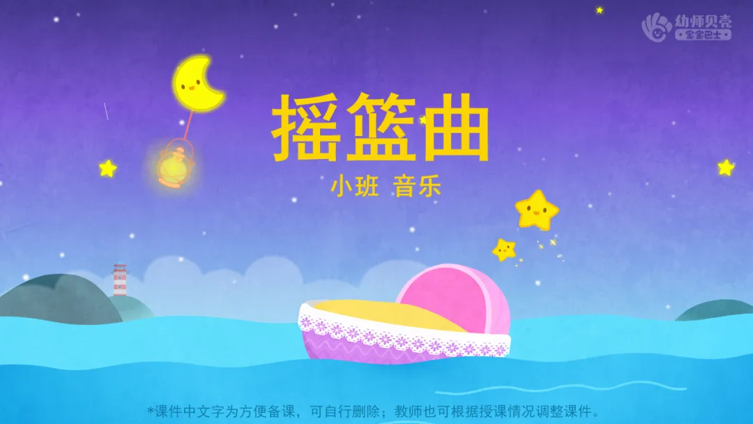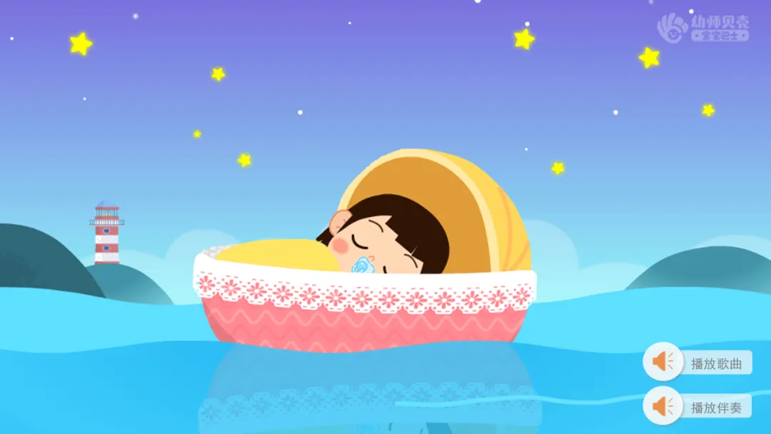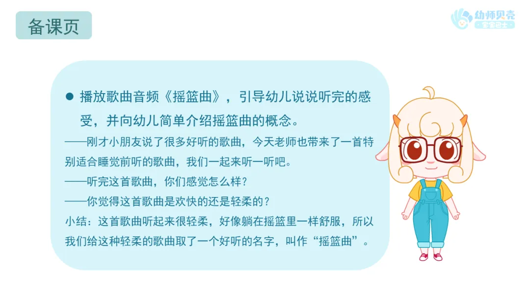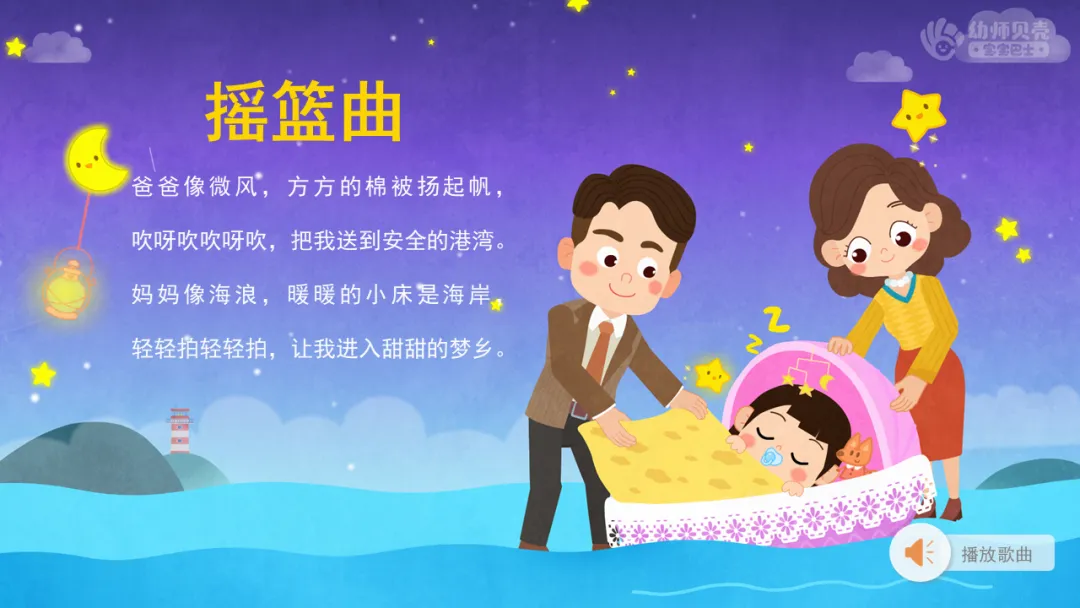 ——刚才小朋友说了很多好听的歌曲,今天老师也带来了一首特别适合睡觉前听的歌曲,我们一起来听一听吧。