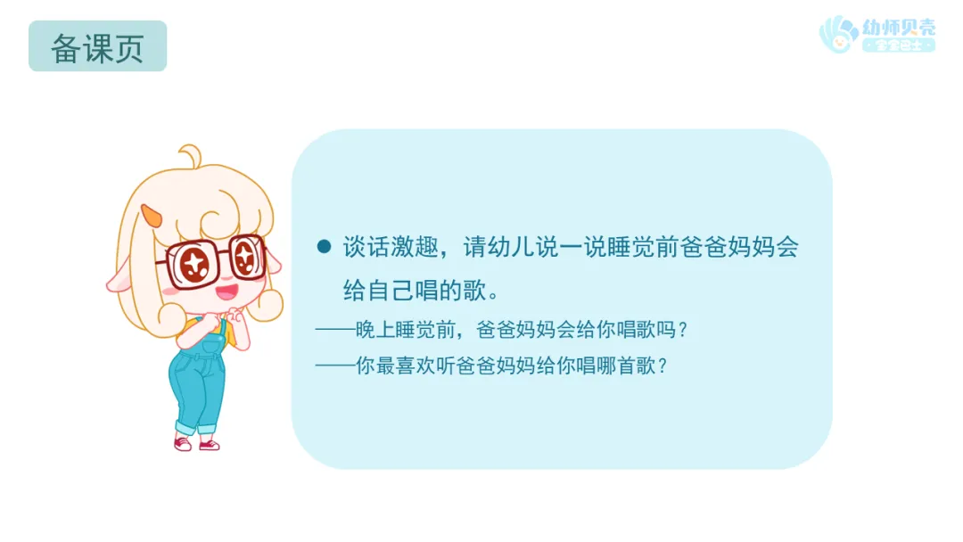 l谈话激趣,请幼儿说一说睡觉前爸爸妈妈会给自己唱的歌。