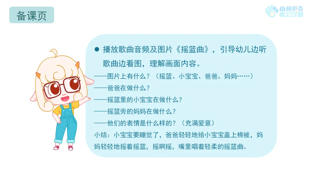 l感受摇篮曲的轻柔,并体会爸爸妈妈给自己唱摇篮曲时的爱意。