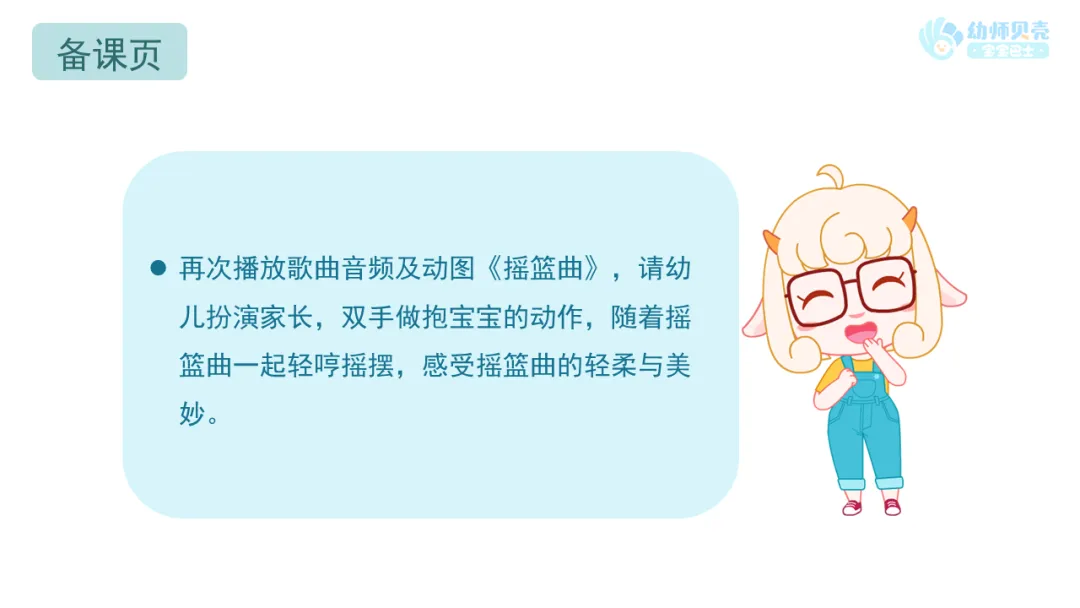 l再次播放歌曲音频及图片《摇篮曲》,请幼儿扮演家长,双手做抱宝宝的动作,随着摇篮曲一起轻哼摇摆,感受摇篮曲的轻柔与美妙。