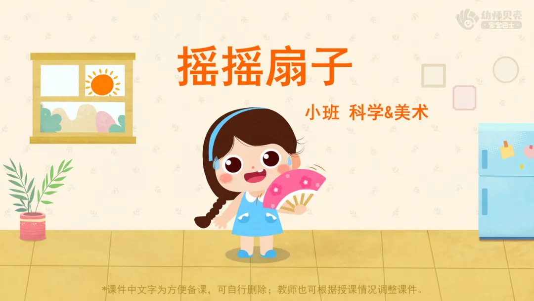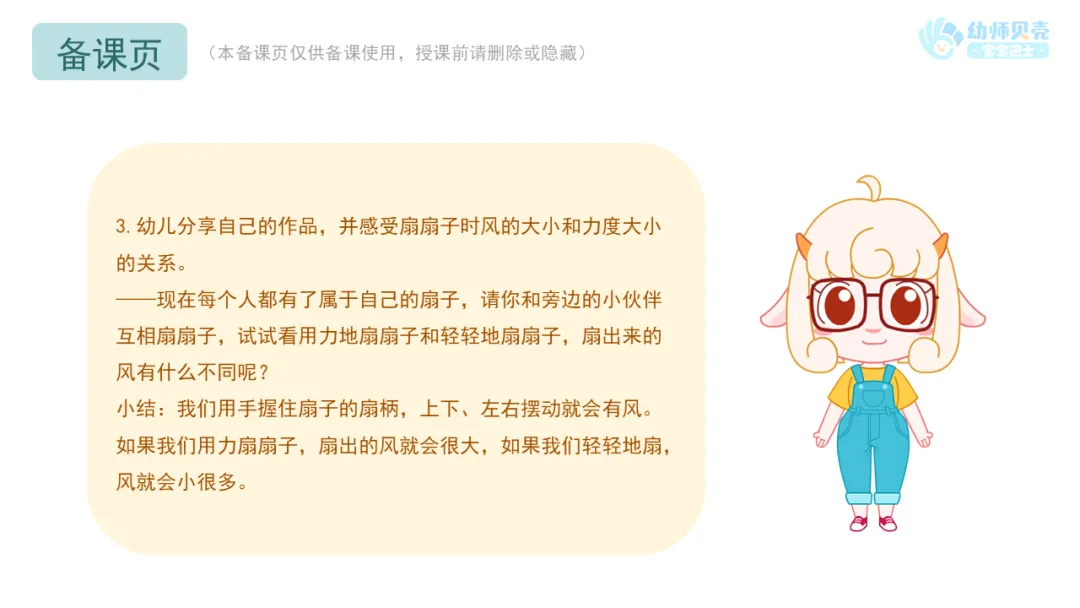 ——现在每个人都有了属于自己的扇子,请你和旁边的小伙伴互相扇扇子,试试看用力地扇扇子和轻轻地扇扇子,扇出来的风有什么不同呢?