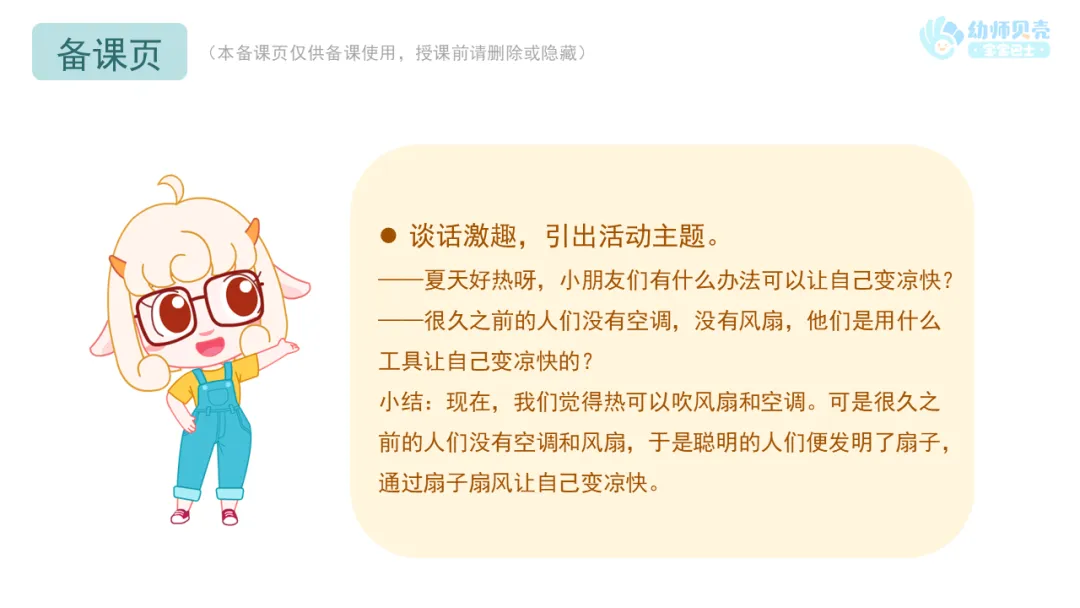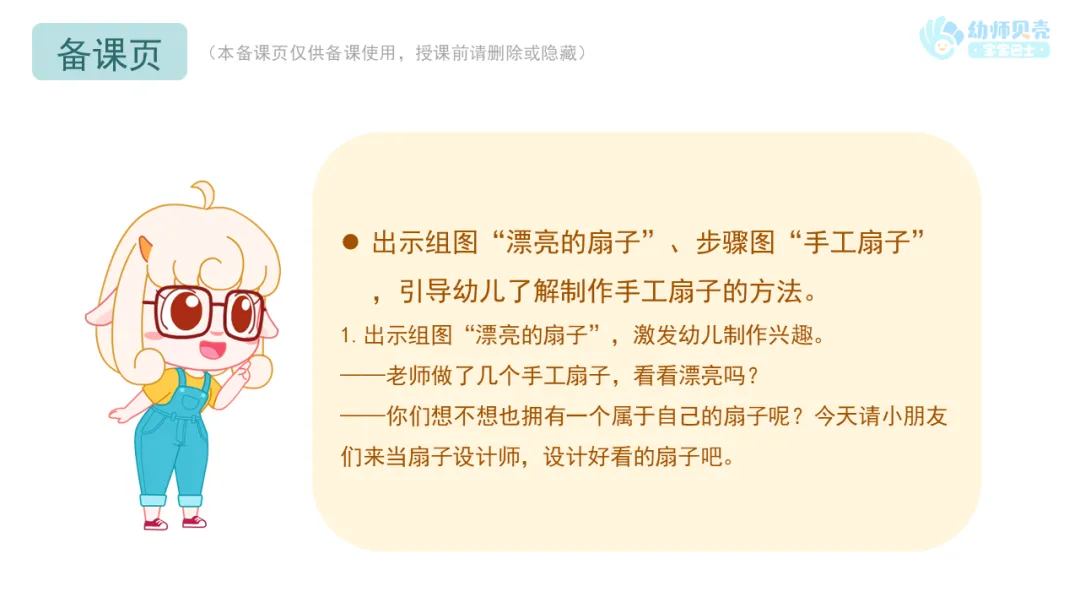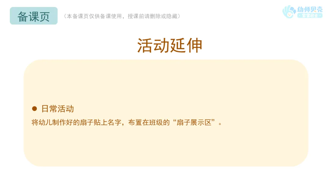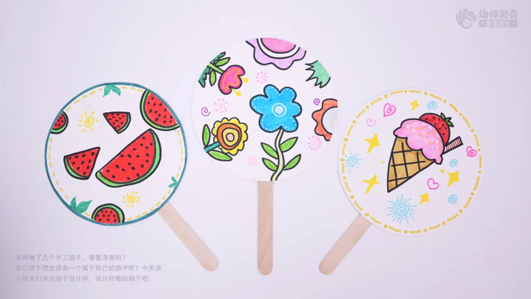 ——你们想不想也拥有一个属于自己的扇子呢?今天请小朋友们来当扇子设计师,设计好看的扇子吧。