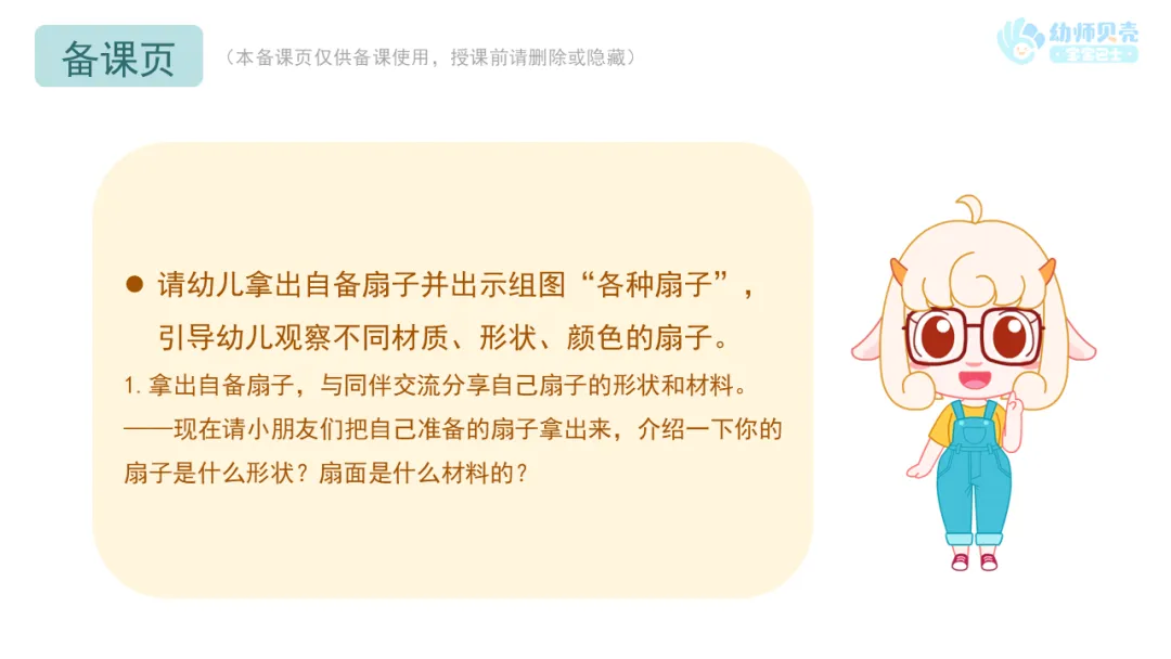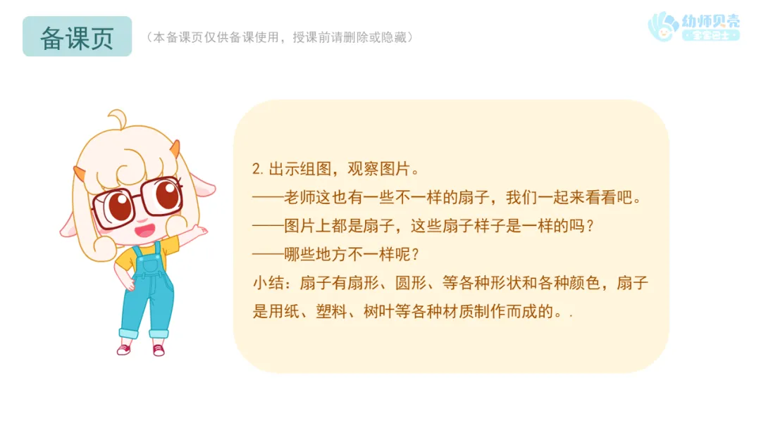 1.拿出自备扇子,与同伴交流分享自己扇子的形状和材料。