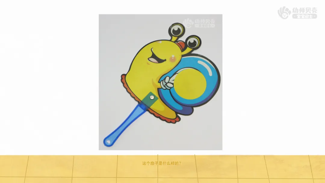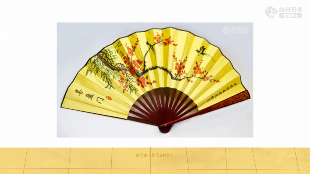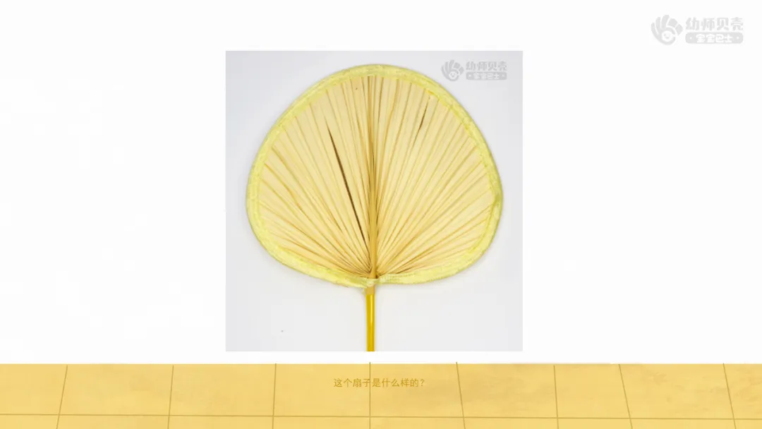 ——现在请小朋友们把自己准备的扇子拿出来,介绍一下你的扇子是什么形状?扇面是什么材料的?