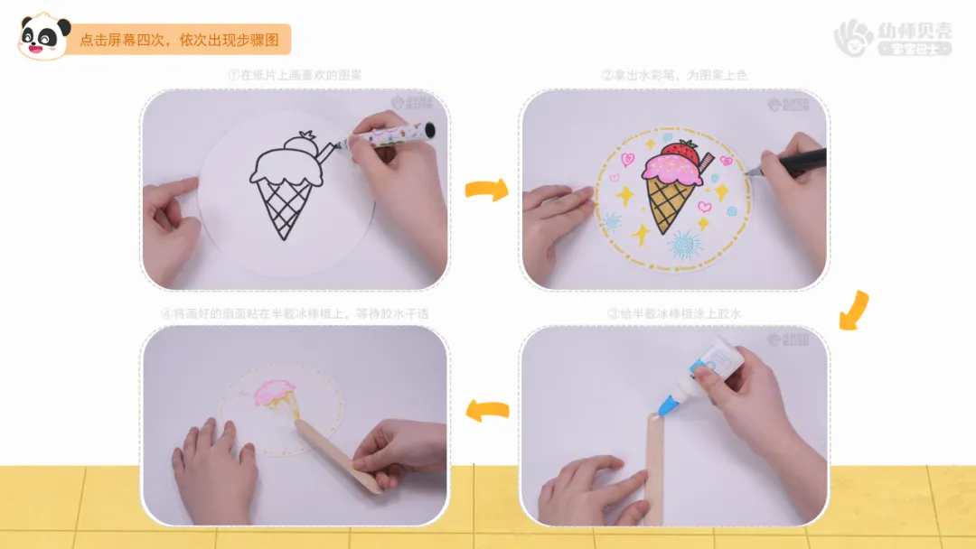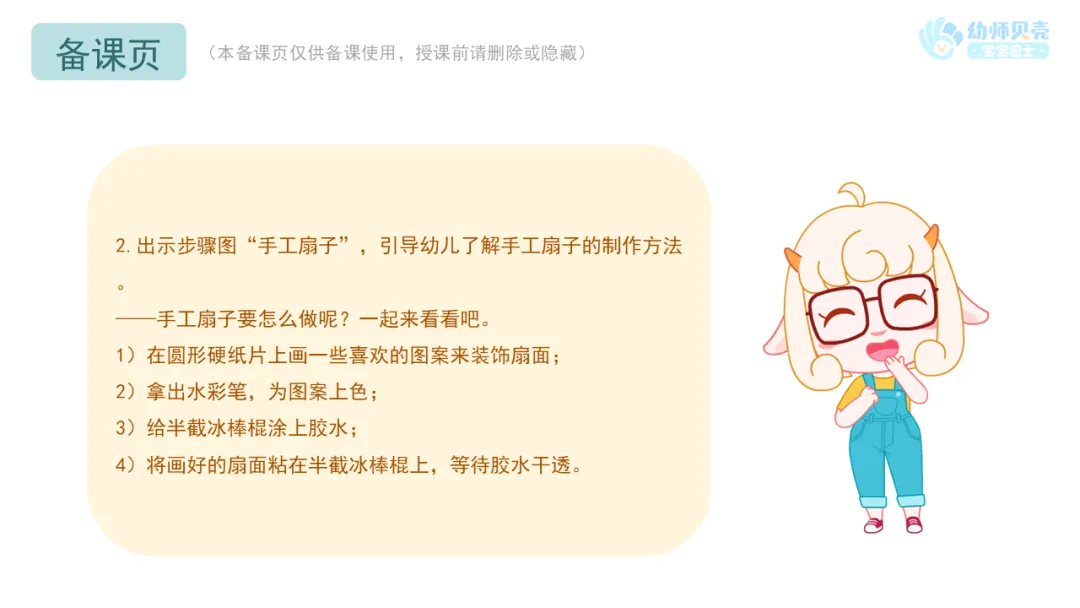 2.出示步骤图“手工扇子”,引导幼儿了解手工扇子的制作方法。