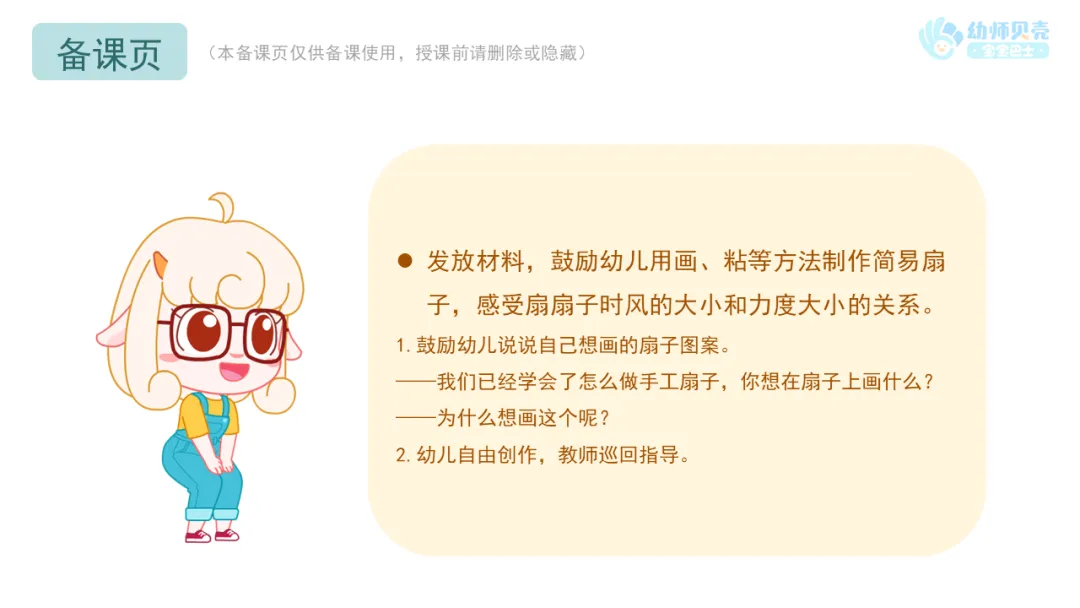 l发放材料,鼓励幼儿用画、粘等方法制作简易扇子,感受扇扇子时风的大小和力度大小的关系。