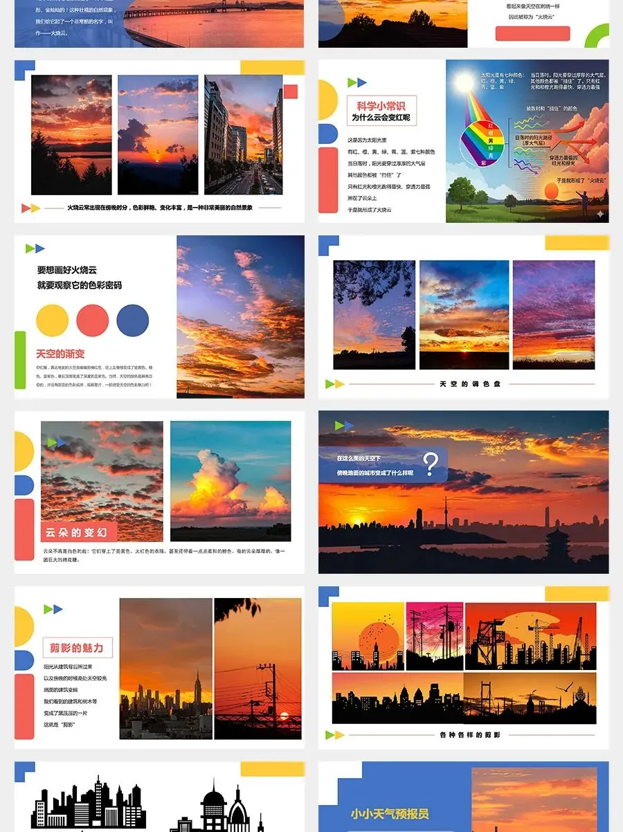 “早霞不出门,晚霞行千里。” 它的意思是说,如果早上看到红霞,可能要下雨;而如果傍晚出现绚烂的晚霞,明天一定是个大晴天!今天,我们要去寻找的就是那抹预示着好天气的、像火一样燃烧的“火烧云”!