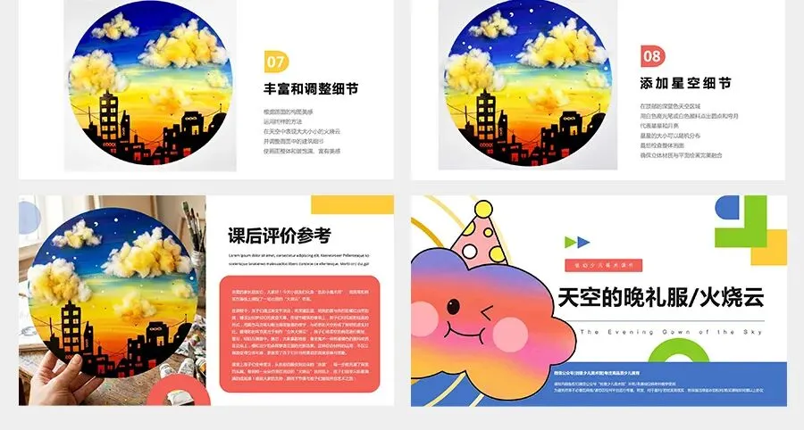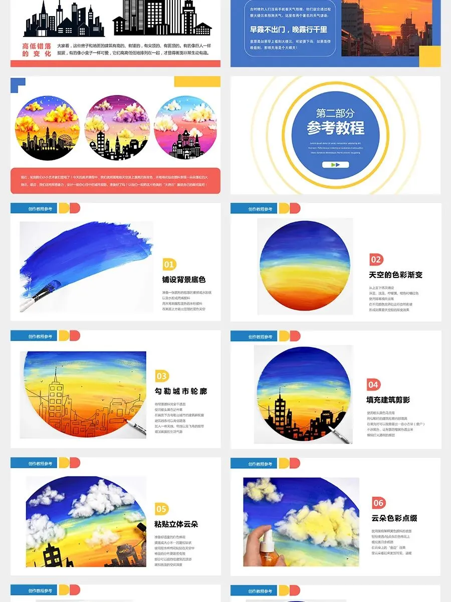 在这节美术课程中,我们将用颜料调和出绚丽的渐变色,用黑色笔勾勒出你心中的城市剪影,用柔软的棉花去“捕捉”云朵。让我们一起动手,把这瞬息万变的火烧云永远留在我们的画作中吧!