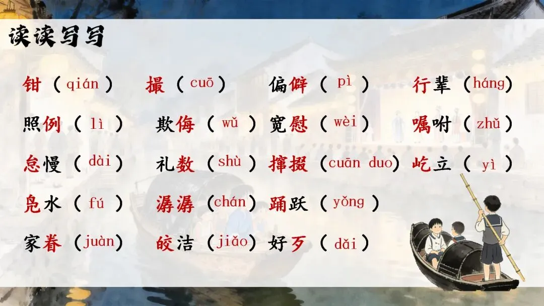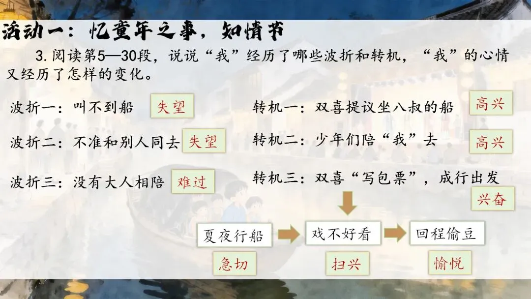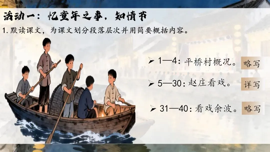 第一课时:介绍背景,作者,完成生字词学习,完成课文整体感知,划分段落层次及理清故事情节;第二课时:完成文章写作手法探究,景物描写、表达方式等学习;分析人物形象;第三课时:深入探究文本,理解情感