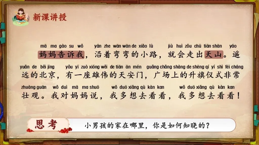 1、师导入:同学们,今天你是一名充满好奇和梦想的旅行者,准备踏上一次寻找梦想之地的奇妙之旅。你的目标是探索妈妈和爸爸告诉你的神秘而美丽的地方,并将这些美妙的发现带回来与同学们分享。