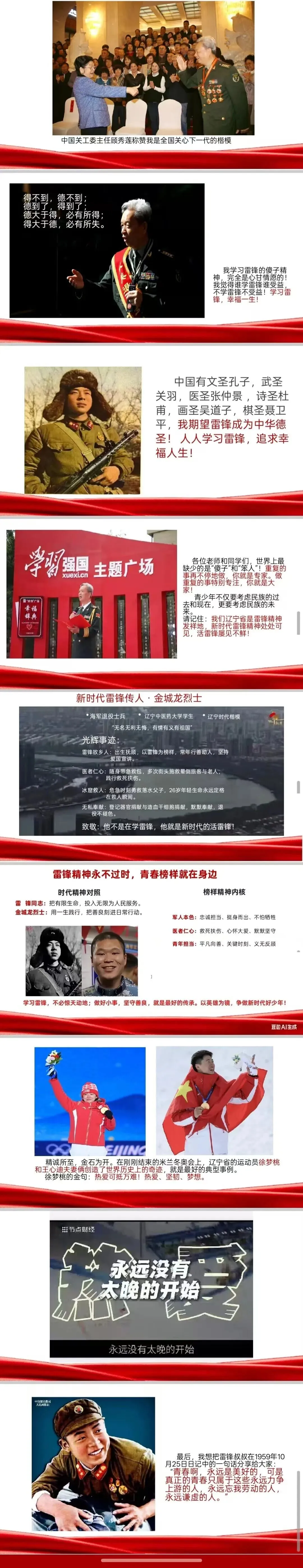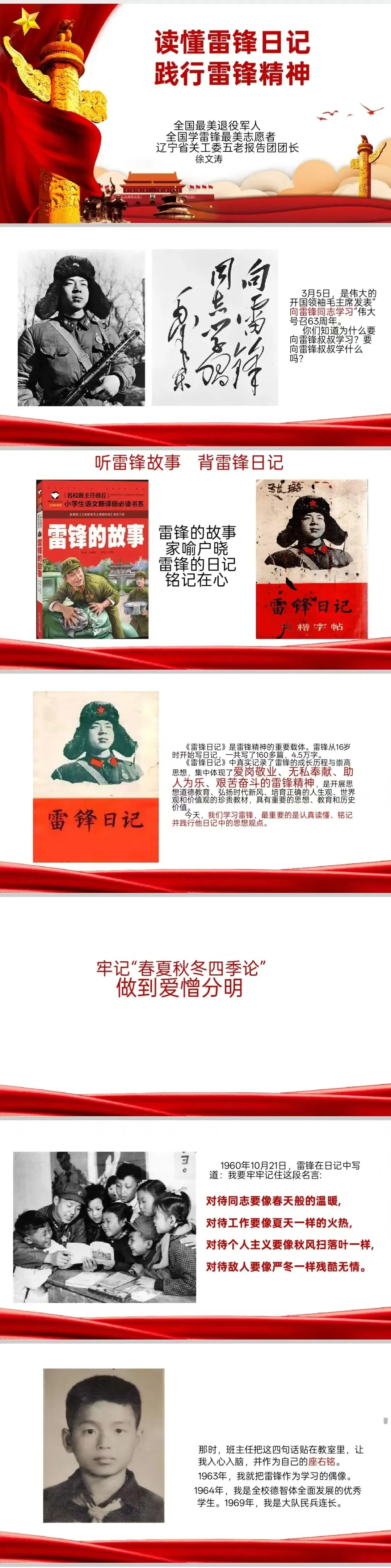 为了促进经验交流与资源共享,进一步提升宣讲教育工作质量,关工委微信公众号开设“优秀课件”专栏,陆续将有代表性和启发性的课件予以刊发,供大家参考借鉴。首期分享全国学雷锋先进个人、全国最美退役军人、辽宁省关工委五老报告团团长徐文涛的《读懂雷锋日记 践行雷锋精神》开学第一课课件,敬请关注。