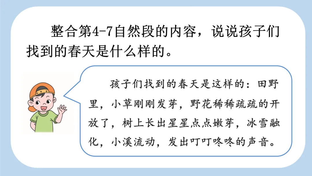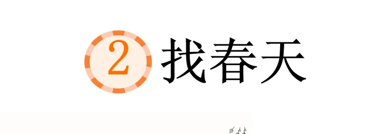 《找春天》是一篇语言优美、充满儿童情趣的散文。一个 “找” 字,说明春天的景象尚没有完全显露出来,是早春时节。早春的景象与仲春、暮春有所不同,文中可以看到:“小草从地下探出头来”“早开的野花一朵两朵”“树木吐出点点嫩芽”“解冻的小溪叮叮咚咚”,都在暗示春天才刚刚开始,还没到春光烂漫的时候。