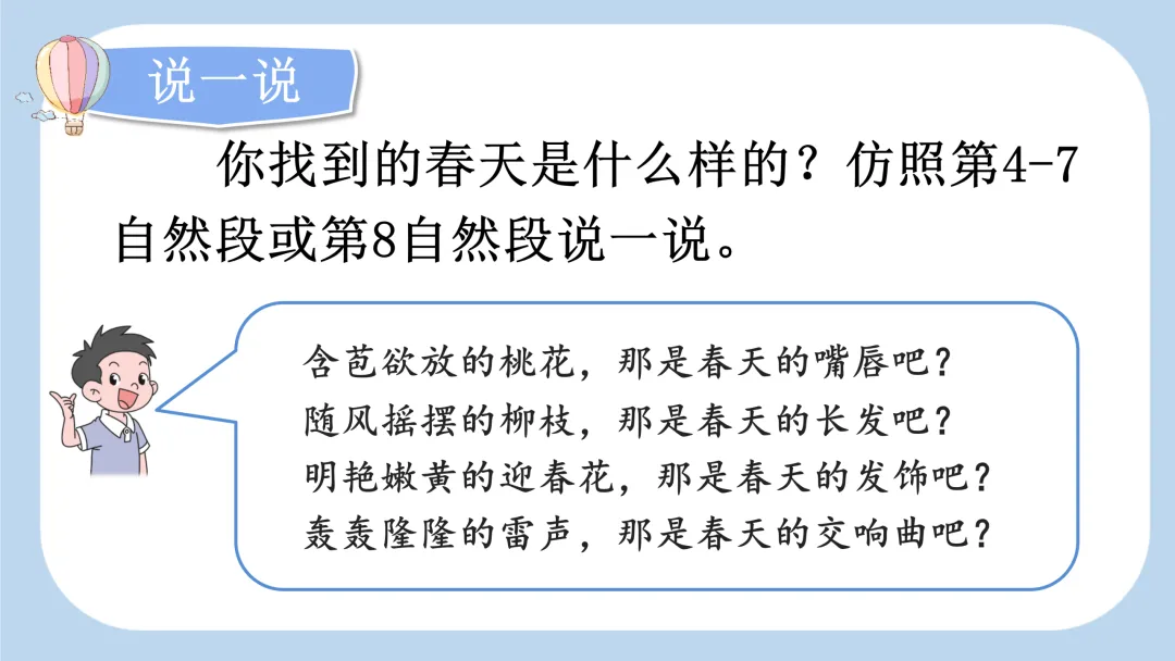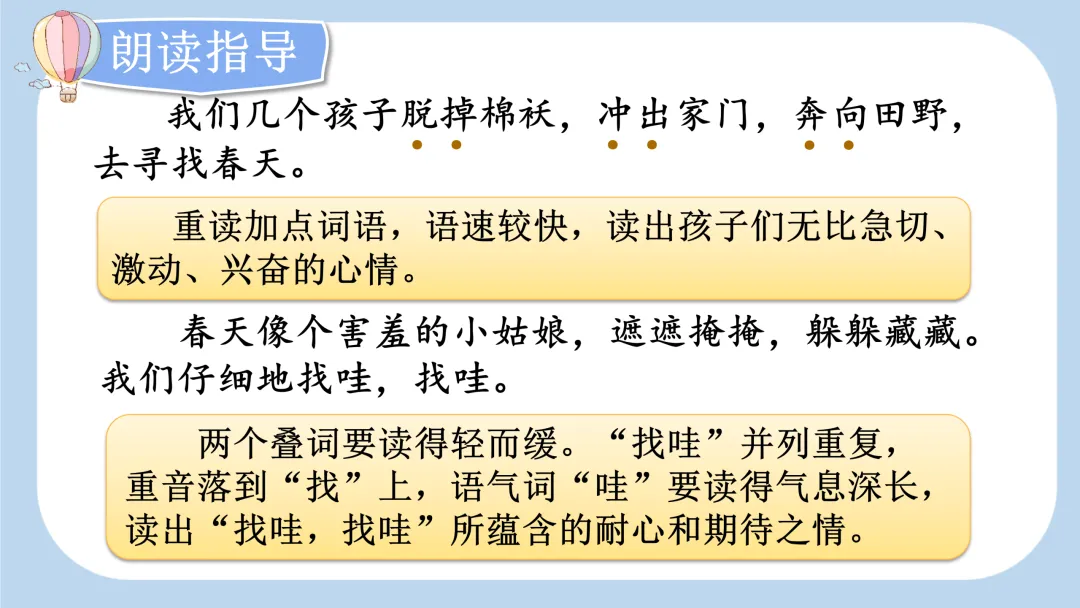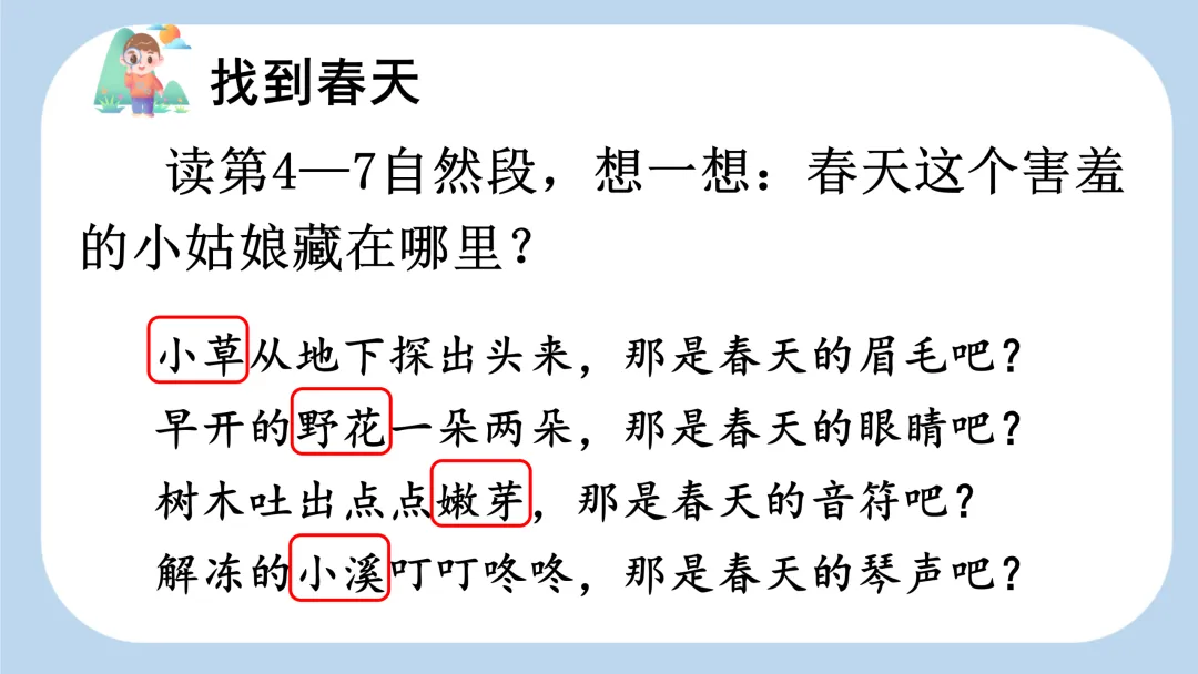 (2)第三自然段,“春天像个害羞的小姑娘,遮遮掩掩,躲躲藏藏”,好像在和 “我们” 玩捉迷藏的游戏。朗读时头脑里要有 “害羞的小姑娘” 的画面,两个叠词读得轻而缓。“找哇,找哇”,并列反复,重音落到 “找” 上,语气词 “哇” 要读得气息深长,读出 “找哇,找哇” 所蕴含的耐心与期待之情。