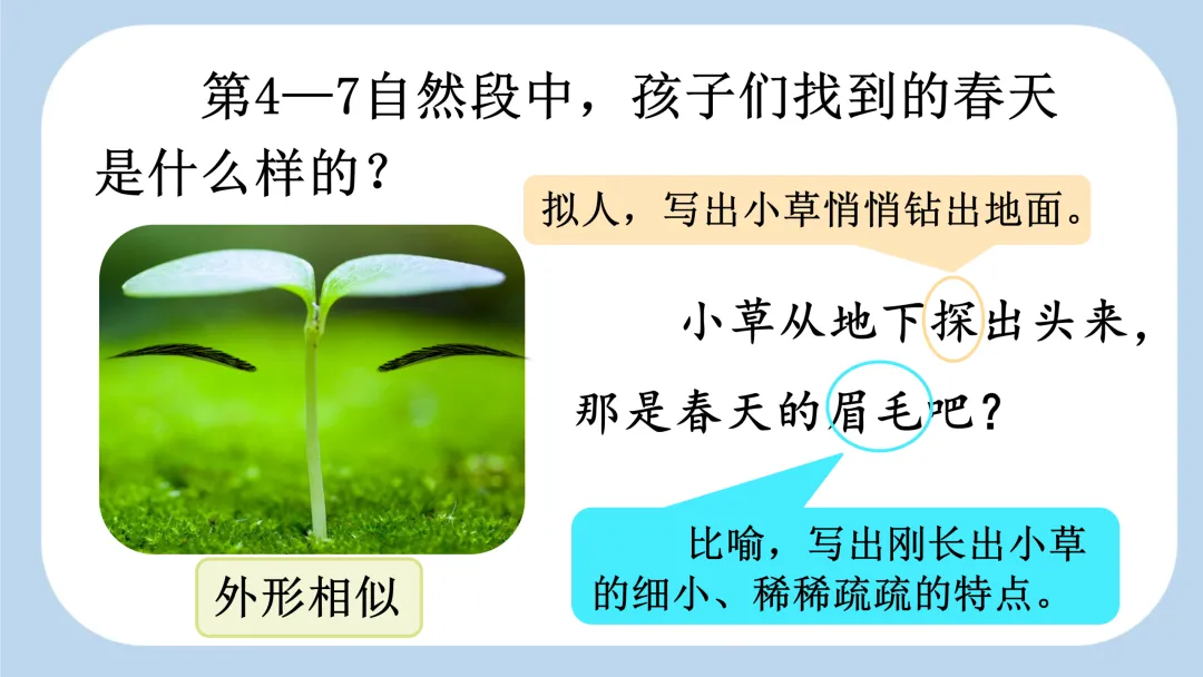 第四至第七自然段的学习,建议以 “春天这个害羞的小姑娘藏在哪里” 这一问题切入。让学生带着问题读课文,发现春天藏在 “小草”“野花”“嫩芽”“小溪” 里。然后借助图片,将 “小草” 与 “眉毛”、“野花” 与 “眼睛”、“嫩芽” 与 “音符”、“小溪” 与 “琴声” 联系起来,并在多形式、多层次的朗读中感受早春的特点,感受语言的生动、形象。
