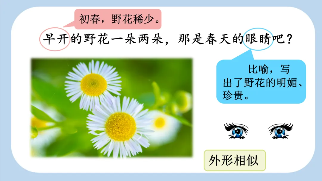 早开的野花一朵两朵,那是春天的眼睛吧?早春的野花十分稀少,藏在草丛里很难发现。为了表达发现之后的喜悦之情,可以把 “眼” 的读音拖长,“睛” 读得轻而短,尾音上扬。