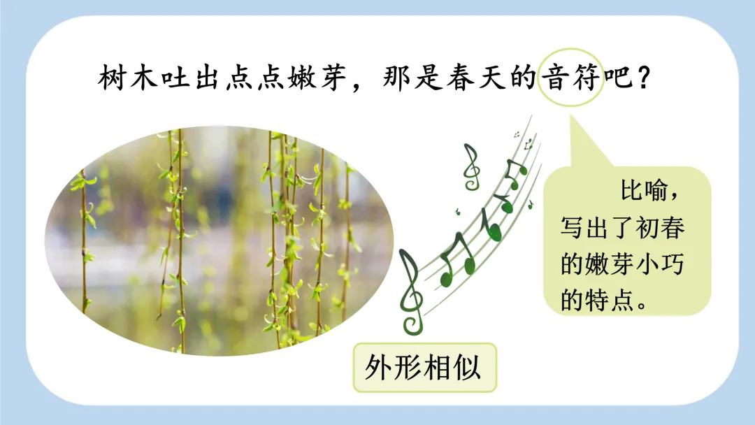 树木吐出点点嫩芽,那是春天的音符吧?用 “音符” 形容嫩芽,说明嫩芽初发,比较小。读这个词时,“符” 的读音可拉长,尾音上扬。