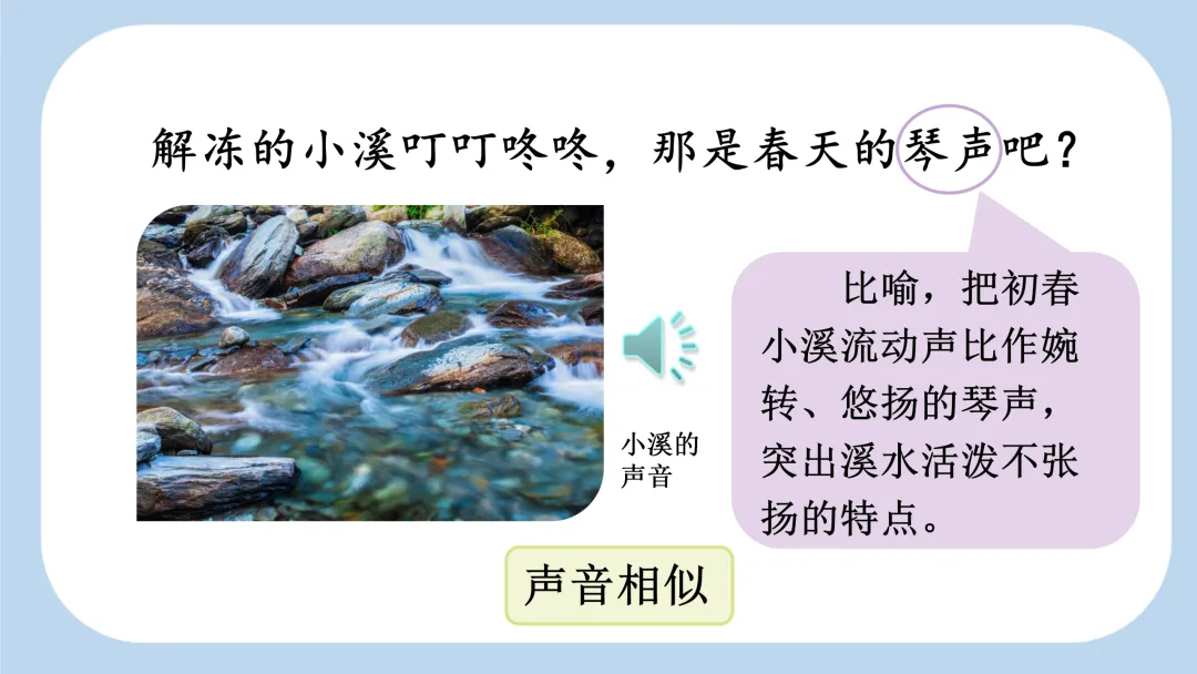 解冻的小溪叮叮咚咚,那是春天的琴声吧?读 “琴声” 时,“声” 的读音拉长,尾音上扬,表现小溪的欢快。