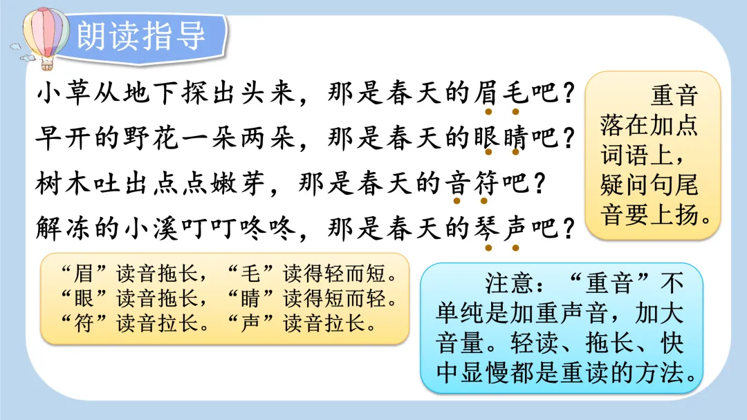 (3)第四至第七自然段,4 段 4 个疑问句,突显出孩子们找到春天后又惊奇又喜悦的心情。如何读出疑问句的语气,在二年级上学期已经有过相关练习,因此这里的朗读指导重在读好句子的重音。根据这组句式的特点,4 句话的重音分别落在 “眉毛”“眼睛”“音符”“琴声” 4 个词语上比较恰当。但值得注意的是,“重音” 不能望文生义地认为就是加重声音,加大音量,这样的认识是不全面的。突出重音的方法多种多样,除了重读之外,还有轻读、拖长、快中显慢等。