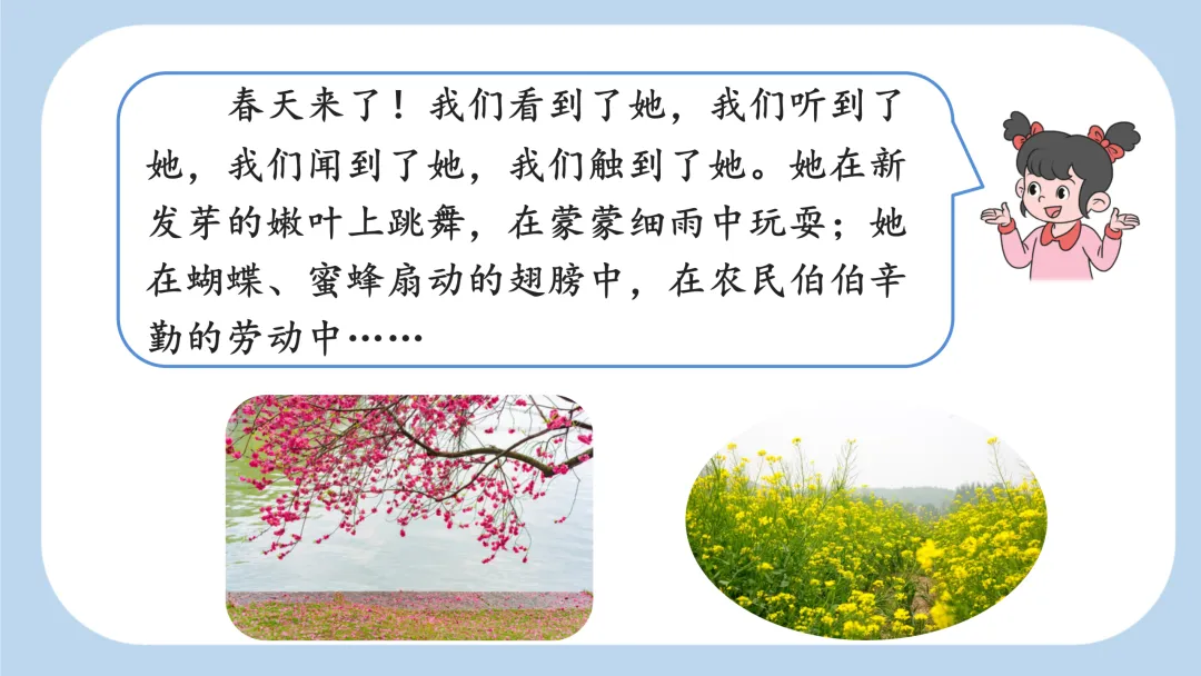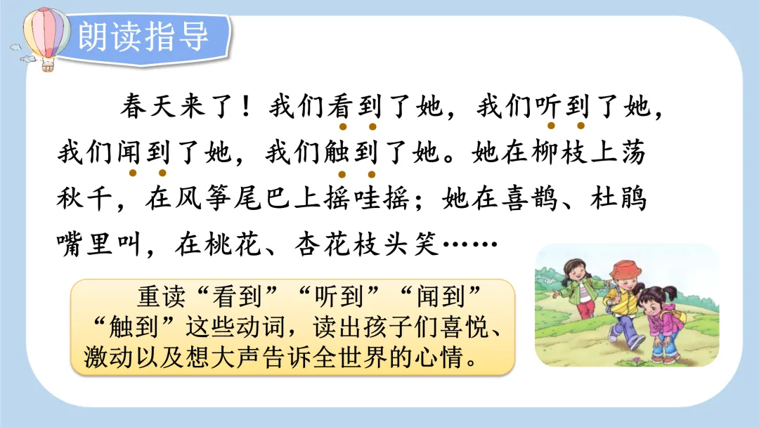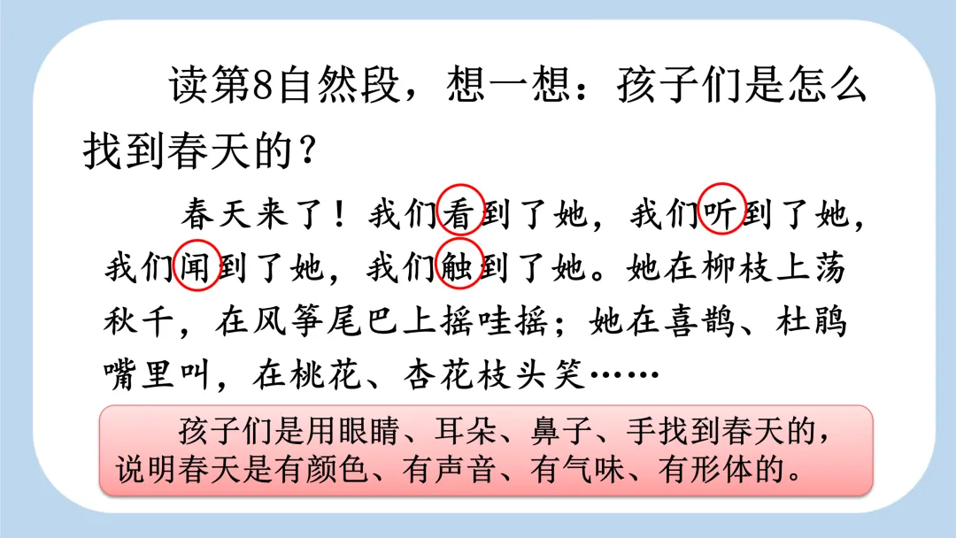 最后一个自然段,“看”“听”“闻”“触” 这几个动词写出 “我们” 是如何找到春天的,同时也说明春天是有色彩、有声音、有气味、有形体的,生动、形象。最后用省略号结尾,给人留下了想象的空间,告诉大家春天已经来到,就在我们身边。