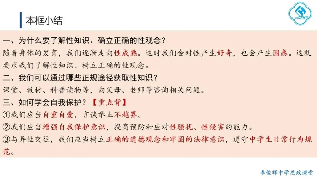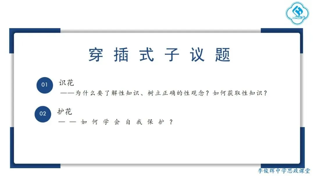 课时设计:随着青春期身心发展,学生的性意识逐渐萌发,也会产生相关困惑。本框内容在了解身心发展(第一框)和掌握两性交往方法(第二框)的基础上,聚焦青春期既敏感又美丽的“性”议题,引导学生认识并守护自己与他人的成长。本课将围绕“如何守护青春之花”这一议题,从“识花”与“护花”两个层面递进展开。课程首先帮助学生理解性知识与正确性观念的重要性,学会通过正规渠道获取相关信息,进而引导学生掌握自我保护的方法,有效预防性侵害。