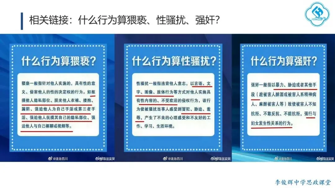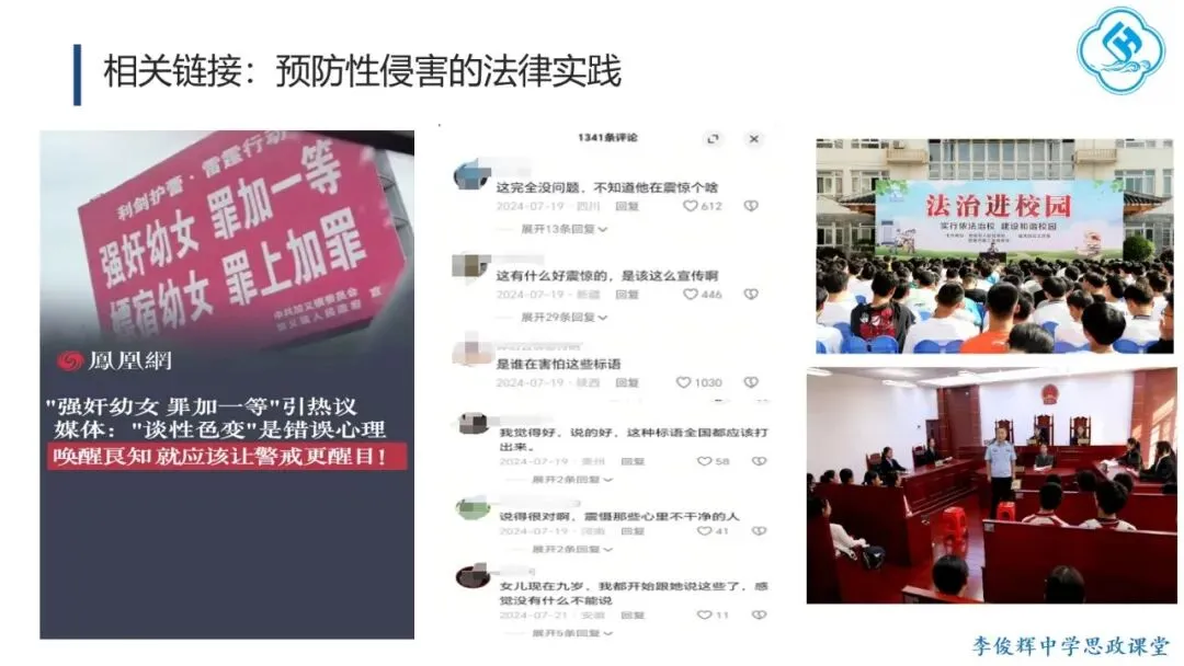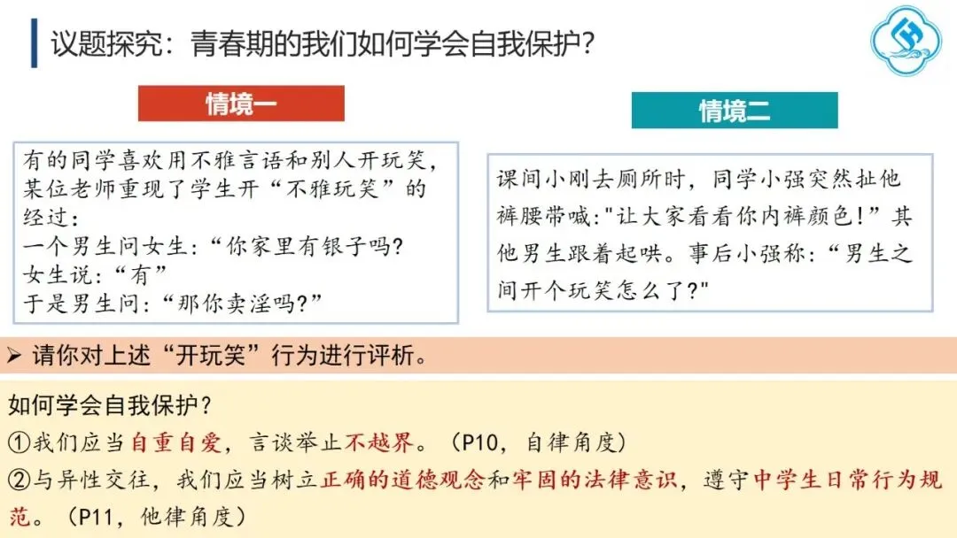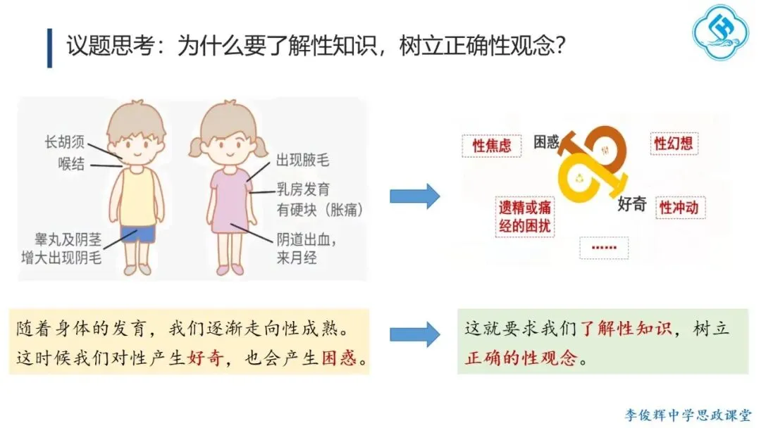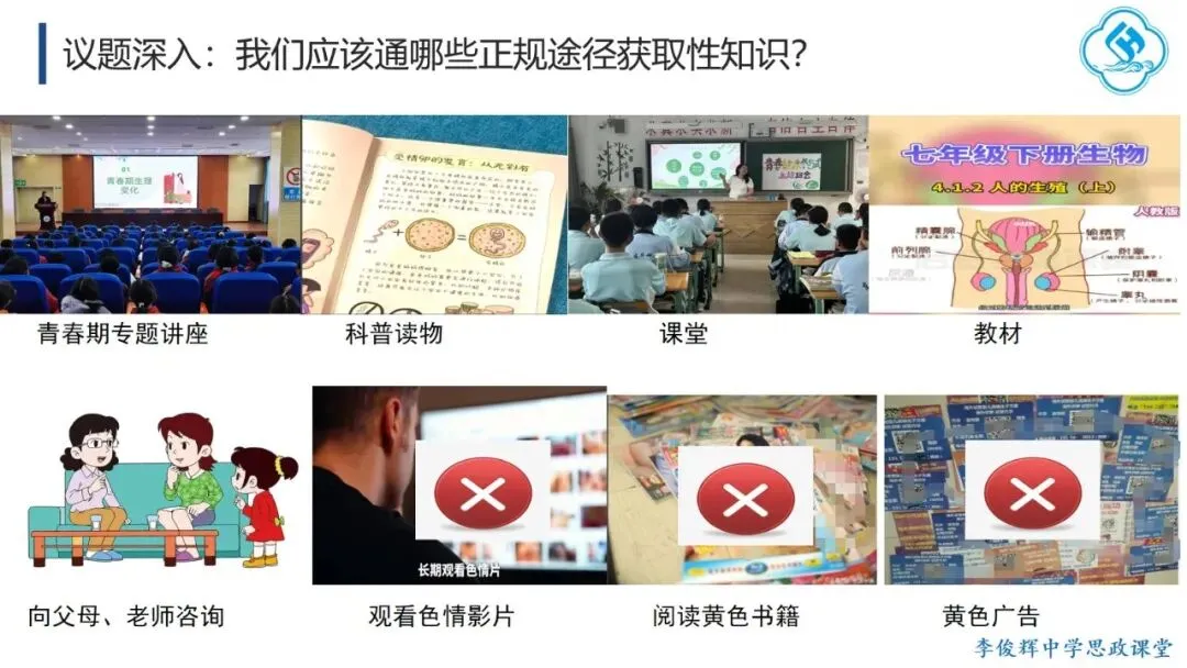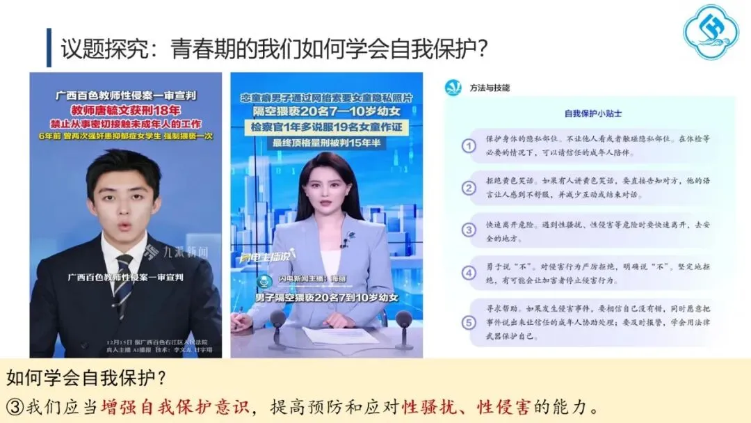 一是敢讲,直面问题不回避。 教师应主动回应学生成长中的真实困惑,直面从“开黄腔、造黄谣”到性侵害等现实问题,引导学生大胆探索、坦然面对、积极处理。二是善讲,贴近实际有方法。 一方面,从学生自身困惑切入,激发内在思考,如以“我从哪里来”这一儿时提问开启话题;另一方面,通过真实案例,既警示学生学会自我保护,也引导其尊重和保护他人。
