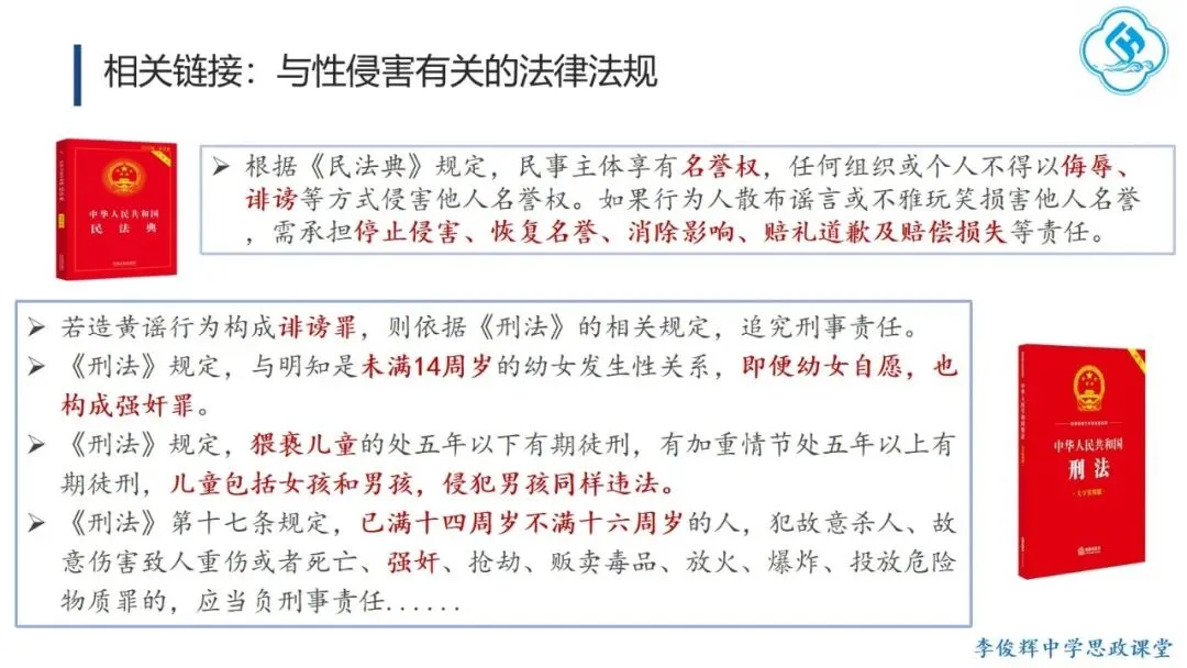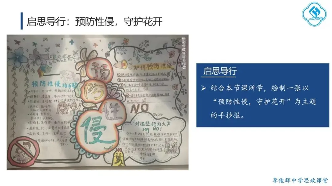 课堂从学生小时候常问的“我从哪里来”引入。这个问题其实与“性”相关,但父母往往用玩笑回避。教师通过询问学生“什么时候”“通过什么方式”才真正了解答案,引导学生意识到:进入青春期后,大家对这类问题越来越感兴趣,这正是性成熟带来的正常好奇与困惑,从而帮助学生接纳这一现象,理解青春期了解性知识、树立正确观念,是成长的必然。同时,教师通过学生获得答案的途径,了解他们获取性知识的渠道,指出非正规来源往往存在误导、夸张甚至扭曲内容,引导学生掌握正确途径,远离不良信息,保护身心健康。课堂在引导学生认识并接纳青春期性心理、初步树立正确性观念后,将重点转向预防性侵害,帮助学生学会自我保护。首先,教师通过“开黄腔”“开黄玩笑”等校园常见案例,引导学生讨论并认识到:这类玩笑并不合适,既不自尊自爱,也可能违背道德与法律。由此帮助学生理解自律与他律是自我保护的基础。接着,教师结合预防性侵害的相关法律法规与实际案例,指出保护未成年人免受性侵害是全社会共识和国家重点工作,引导学生主动学习并善用法律保护自己。同时,教师通过展示真实案件——如教师猥亵学生被依法顶格量刑、隔空猥亵网络性侵案——警示学生增强防范意识,提升识别与应对性骚扰、性侵害的能力,并介绍实用的自我保护方法。最后,教师引入法律对猥亵、性骚扰、强奸等行为的界定,帮助学生及时识别潜在风险,进一步增强自我保护的意识和能力。最后,学生围绕“预防性侵、守护花开”主题绘制手抄报,在创作中巩固所学,将自我保护意识内化于心,以实际行动守护美好的青春。教学提示:针对思政课教师开展青春期性教育,应立足立德树人根本任务,做到以下两点: