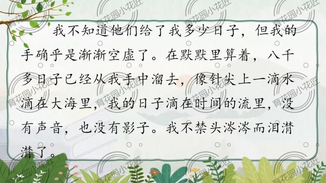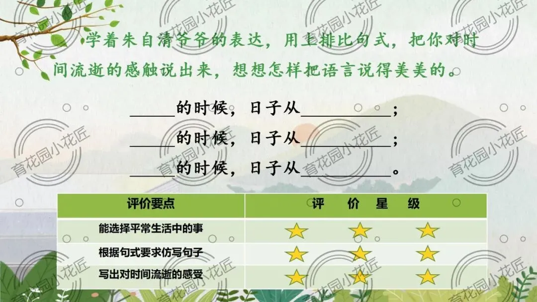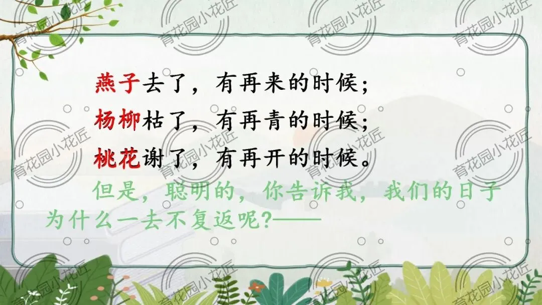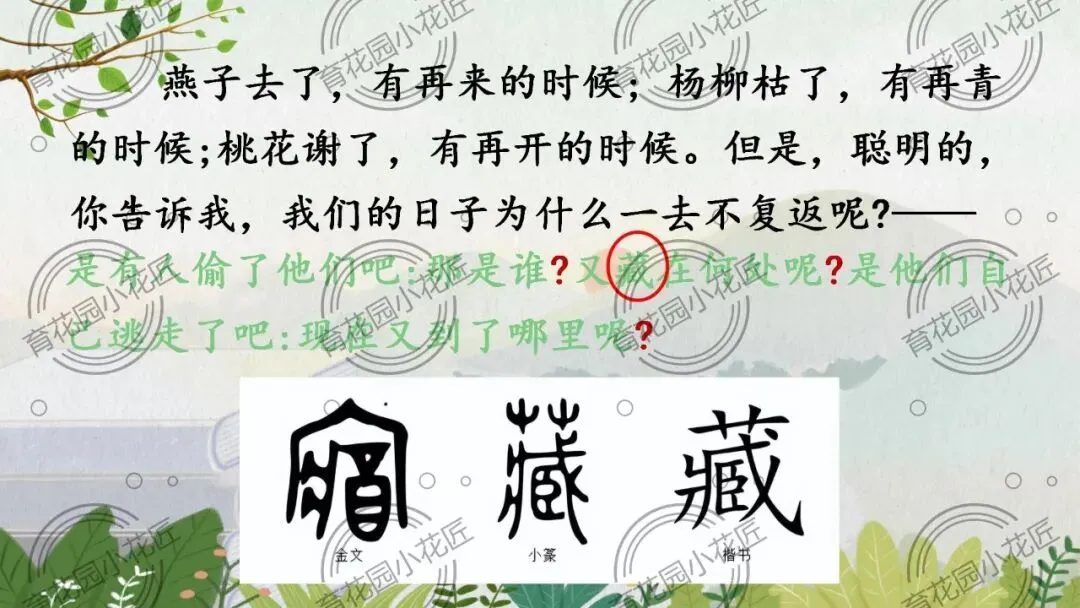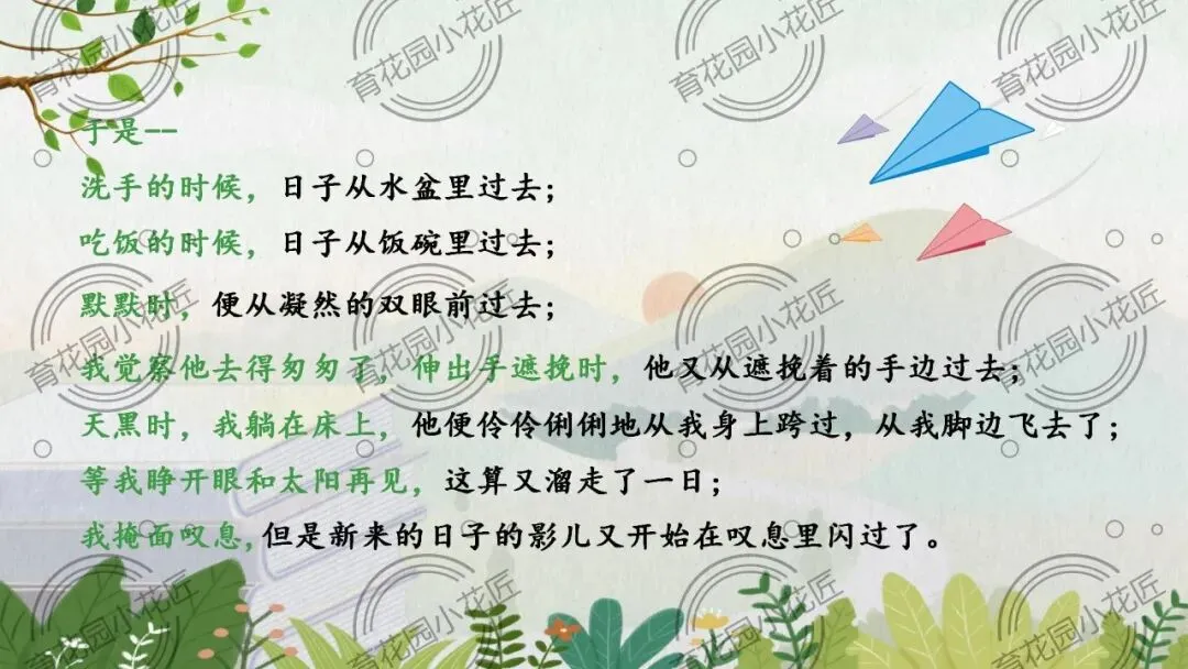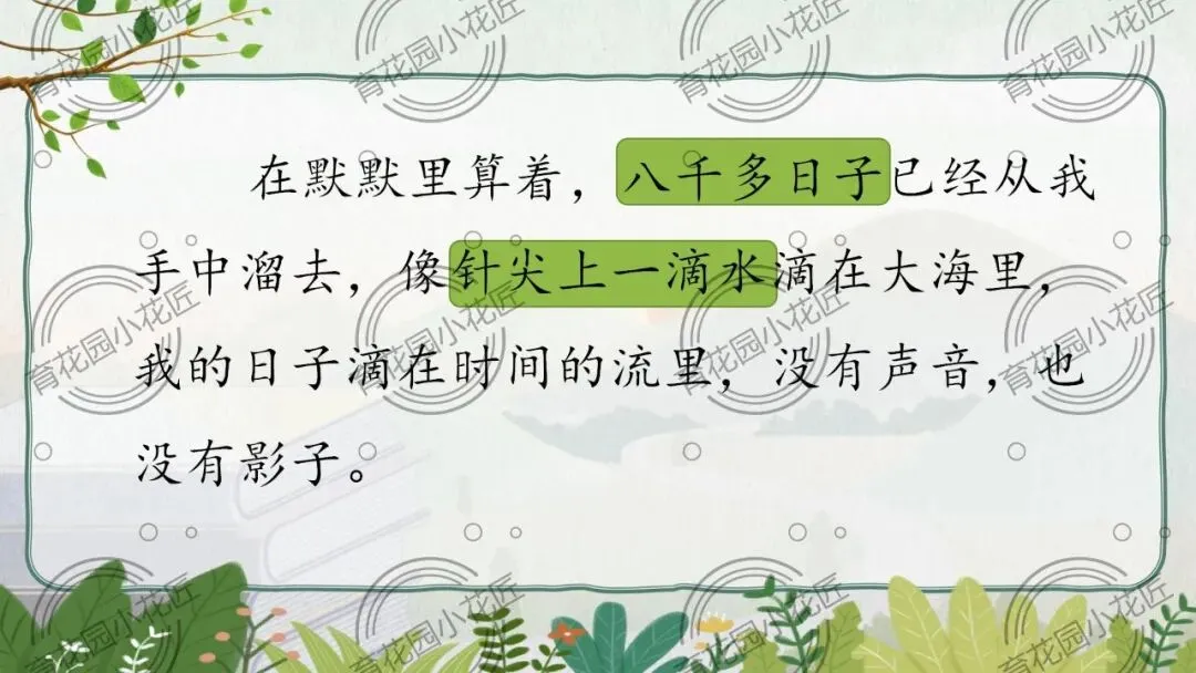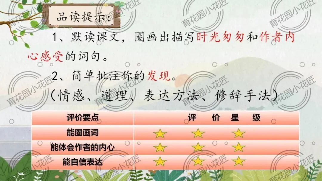 本课牢牢锚定单元“体会文章是怎样表达情感的” 核心语文要素,以 “读、品、悟、用” 为主线贯穿全程。识字教学融于文本语境,从 “匆” 的书写提醒到 “藏” 的字理解析,扎实又灵动;以朗读为核心抓手,通过合作读、分层品读、配乐读等多样形式,让学生在声情并茂的诵读中,体会作者对时光流逝的惋惜与自省,轻松破解经典文本的时代隔阂。