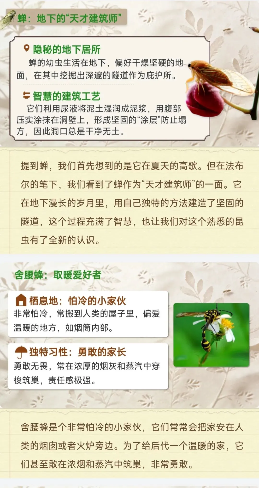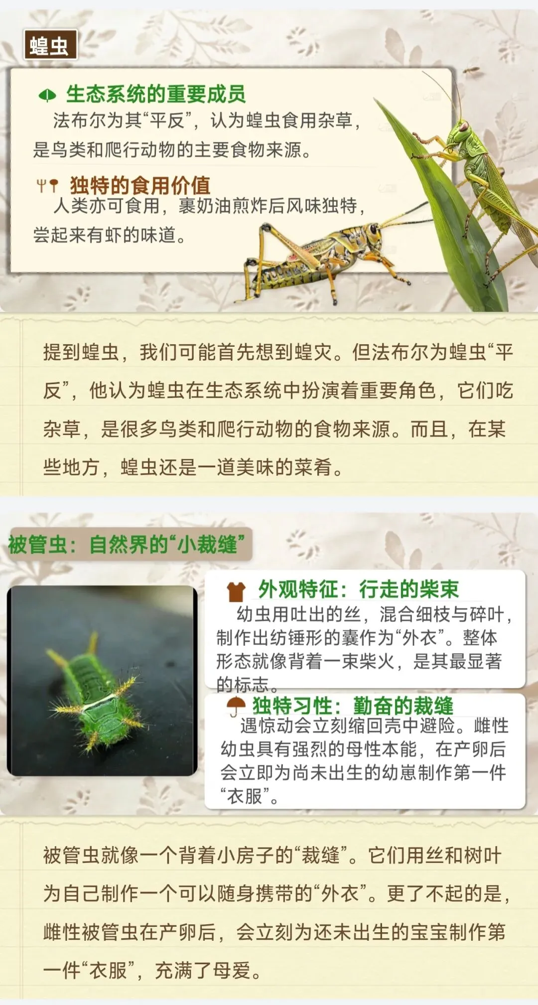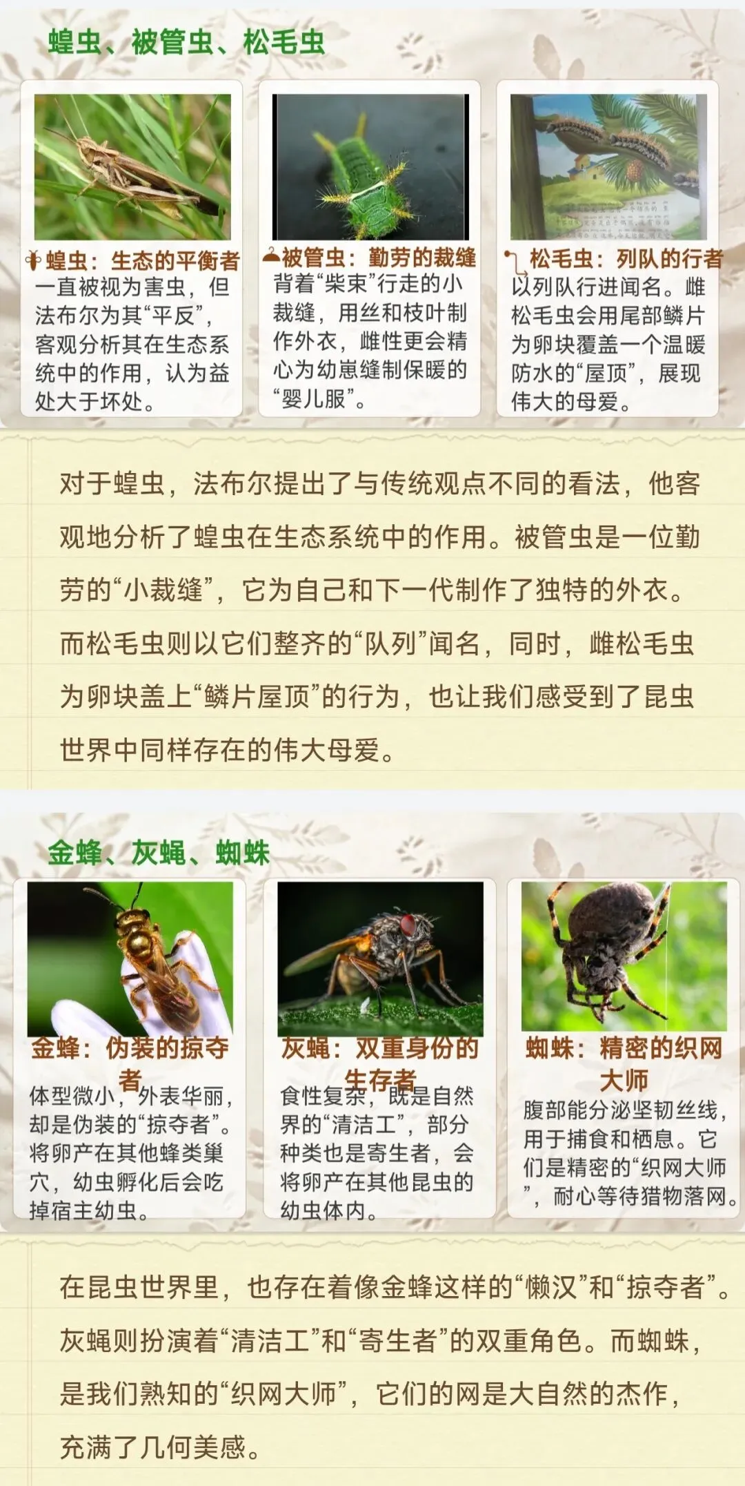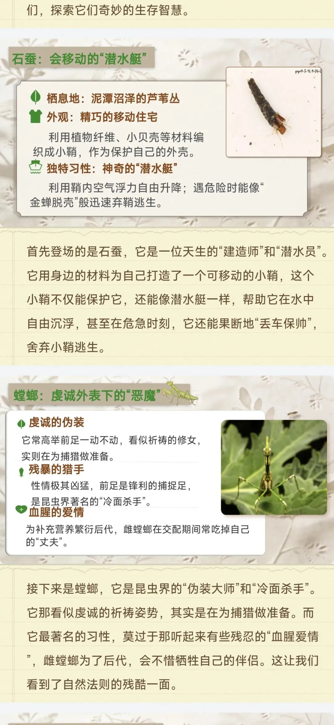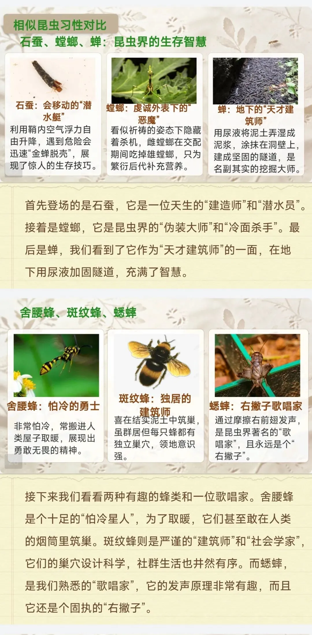 ✅18种核心昆虫全档案:石蚕、螳螂、蝉、蜣螂等中考高频昆虫,栖息地、独特习性、生存智慧逐一拆解,每个昆虫标注考点重点,学生一看就懂,不用再翻书找细节!