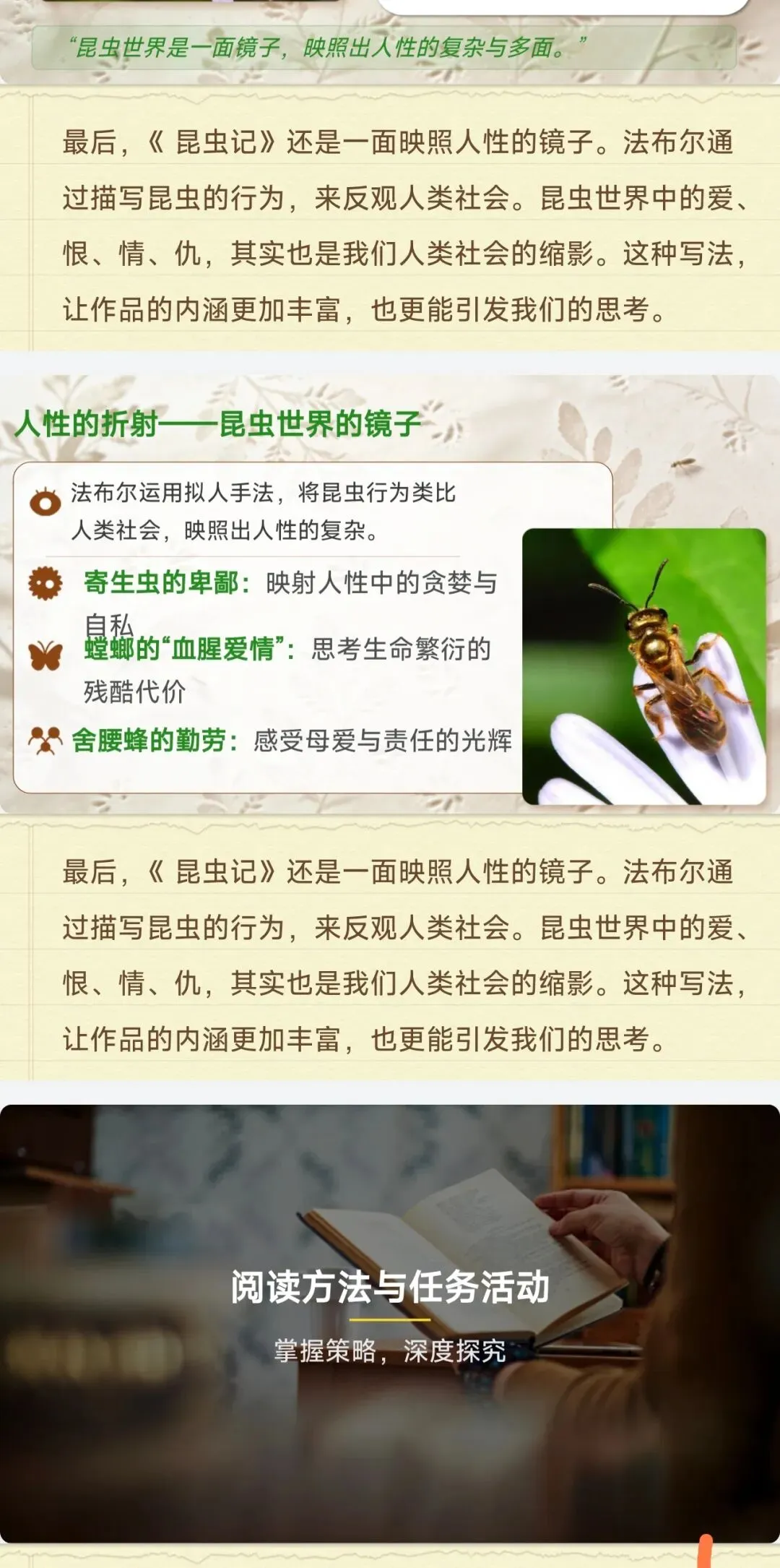 ✅阅读方法全指导:批注式、对比式、情境代入法等实用策略,结合《昆虫记》原文案例讲解,教学生如何读名著、如何抓考点、如何答主观题,授人以渔!