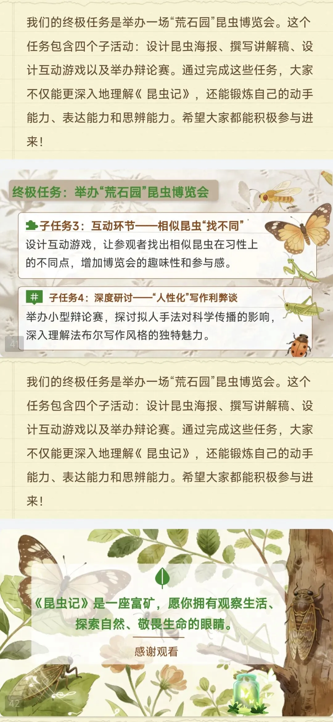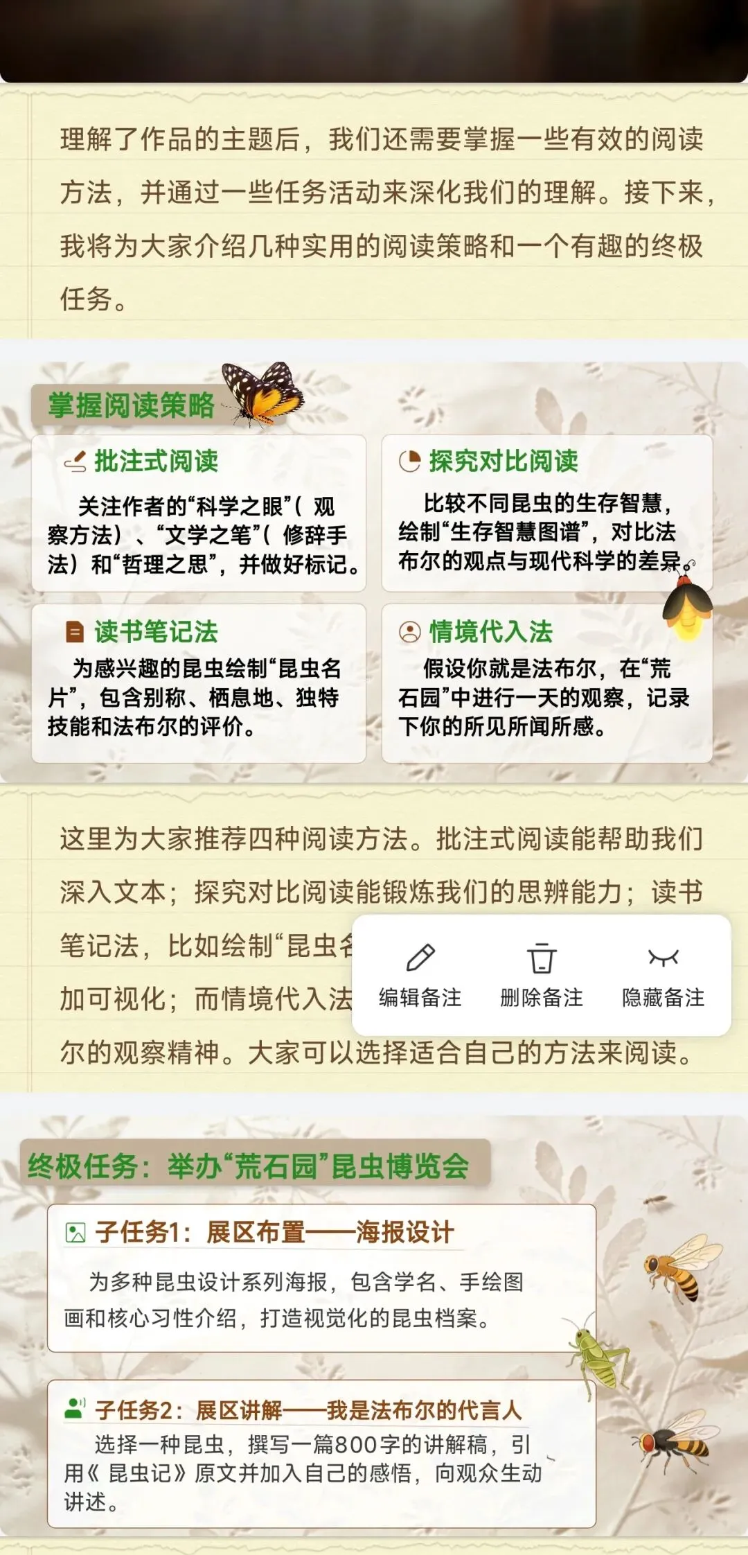 ✅课堂活动全套设计:批注阅读、昆虫名片绘制、“荒石园”博览会、辩论赛等现成活动方案,子任务清晰、要求明确,直接落地课堂,让名著复习不枯燥,学生参与感拉满!