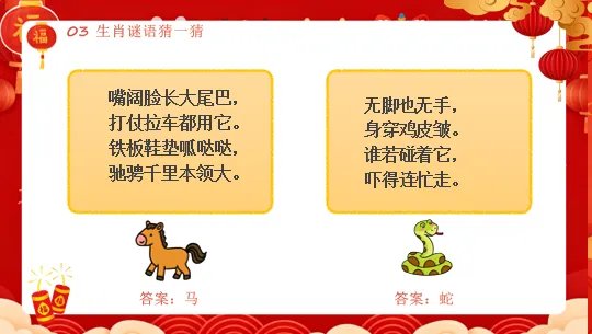 随着幼儿对年的习俗越来越深入的感知和参与,关于生肖的好奇也随之而来。2026年即将迎来马年,结合这一节点,通过图中趣味化的内容(生肖认知、故事、谜语、马年知识),以游戏化、互动化的方式帮助幼儿认识十二生肖,感受传统文化的趣味性,同时借助助教活动搭建家园共育的桥梁,让幼儿在轻松氛围中了解民俗、爱上传统。