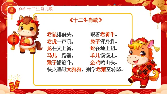 认识十二生肖的12种动物,熟记“鼠、牛、虎、兔、龙、蛇、马、羊、猴、鸡、狗、猪”的排列顺序;知道2026年是马年,了解马在十二生肖中的象征意义;理解“十二生肖(属相)是传统记年、代表出生属相”的文化内涵。