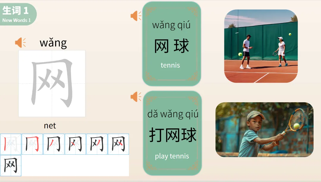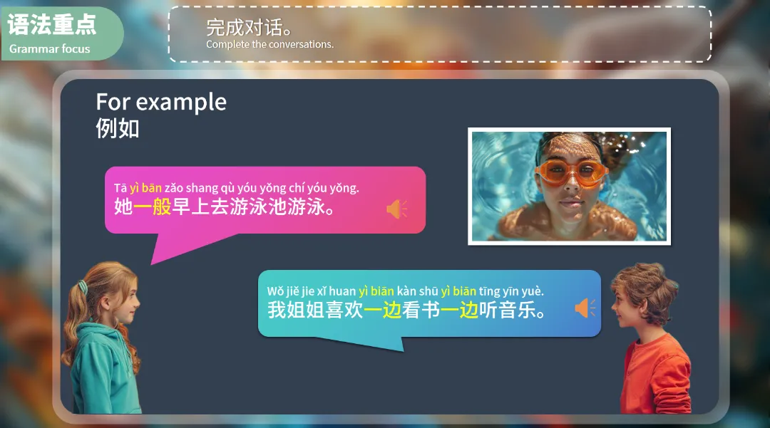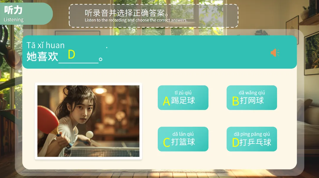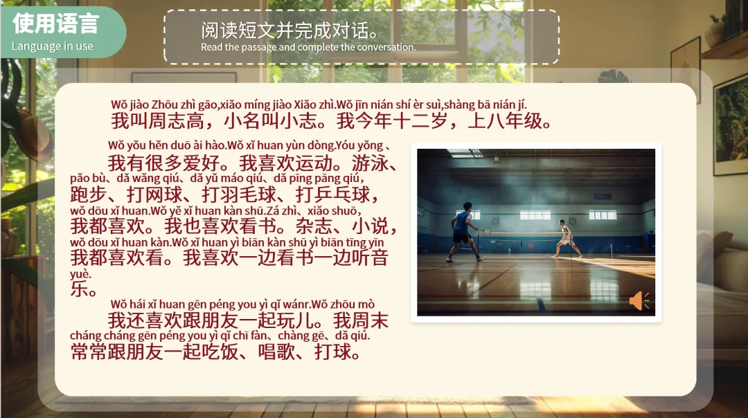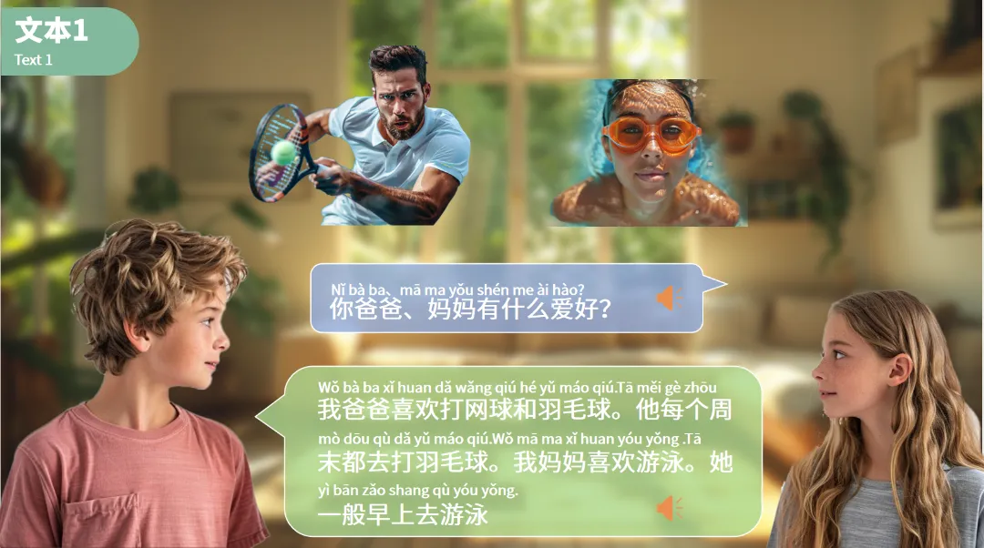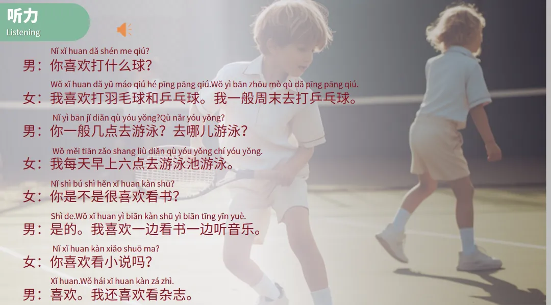 前者结合人物打乒乓球的图片,让学生聆听录音,选出人物的爱好;后者以完整的听力对话为基础,呈现 “谈论球类运动、游泳习惯、阅读爱好” 的核心内容,让学生在听读结合中,提升中文听力敏感度,同时巩固课堂所学。