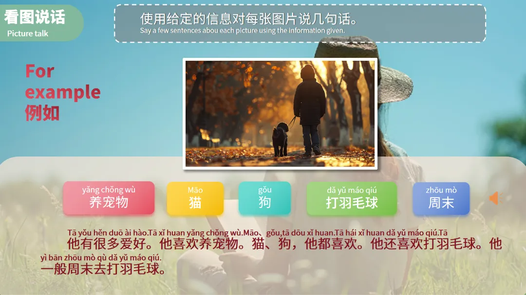 他喜欢养宠物…… 他一般周末去打羽毛球”,引导学生结合词汇与图片,组织语言完成语段表达,实现 “词汇→句子→语段” 的逐级提升。