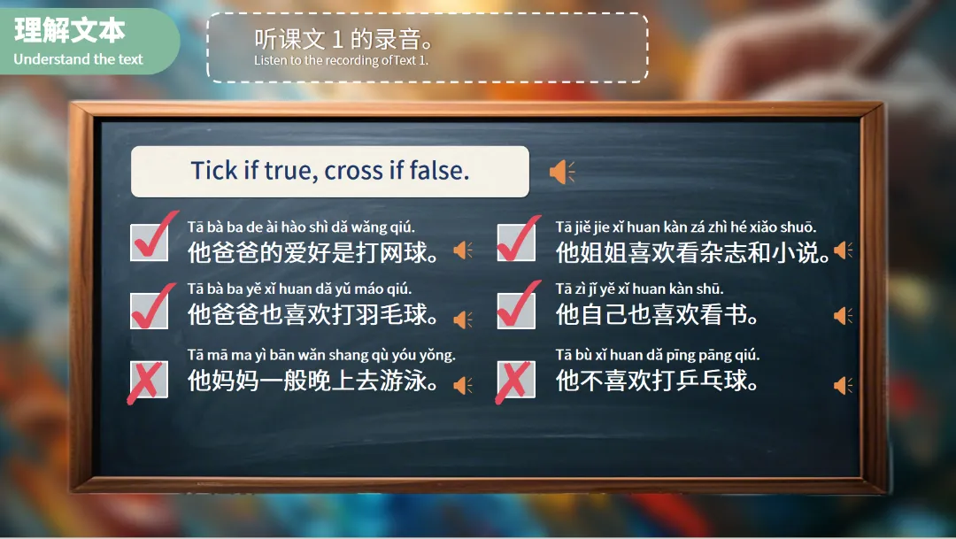 以 “询问家人爱好” 为主题的核心对话《文本 1》为载体,设计 “判断对错” 的练习形式。学生通过聆听录音、精读文本,判断 “他爸爸的爱好是打网球”“他妈妈一般晚上去游泳” 等表述的正误,在练习中强化对文本内容的理解,同时巩固 “爱好” 相关词汇与句式。