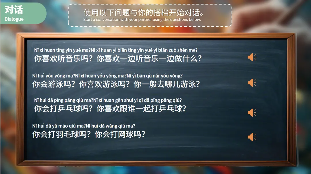 课件设计了一系列针对性对话问题,如 “你喜欢听音乐吗?你喜欢一边听音乐一边做什么?”“你会打羽毛球吗?你会打网球吗?”,覆盖游泳、乒乓球、音乐、阅读等多个爱好场景。学生以小组为单位,运用所学知识完成互动对话,真正实现 “学以致用”,突破口语表达难关。