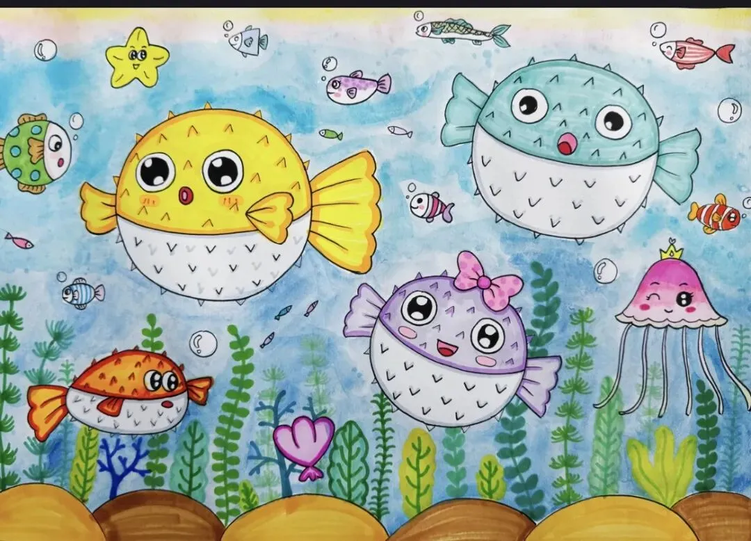 刺豚长得特别可爱,圆乎乎的像个小气球,身上长满细细尖尖的刺,眼睛圆圆的、亮亮的,嘴巴小小的,看起来又呆萌又勇敢。今天我们就用画笔,把这只可爱的刺豚请到画纸上,用漂亮的线条和鲜艳的颜色,创作一幅独一无二的《可爱的刺豚》。