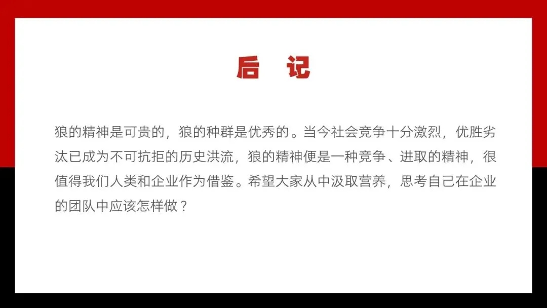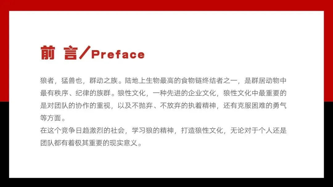 在这个竞争日趋激烈的社会,学习狼的精神,打造狼性文化,无论对于个人还是团队都有着极其重要的现实意义。
