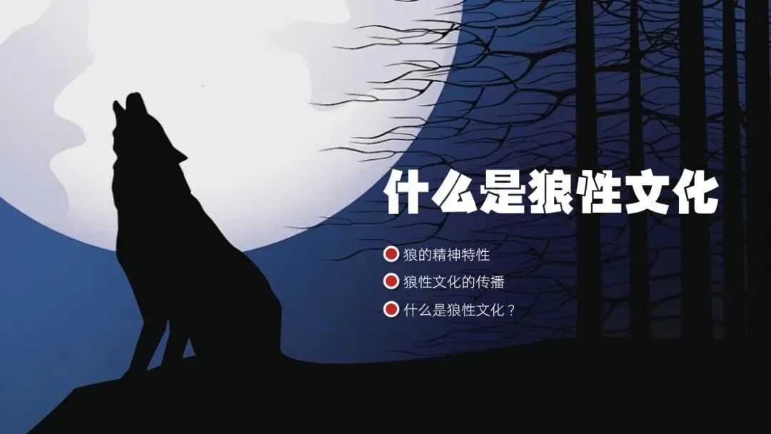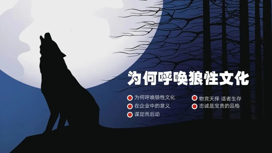 狼者,猛兽也,群动之族。陆地上生物最高的食物链终结者之一,是群居动物中最有秩序、纪律的族群。狼性文化,一种先进的企业文化,狼性文化中最重要的是对团队的协作的重视,以及不抛弃、不放弃的执着精神,还有克服困难的勇气等方面。