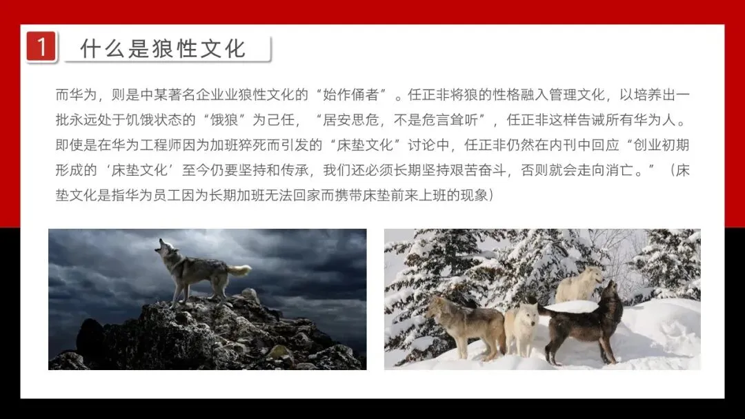 而华为,则是中某著名企业业狼性文化的“始作俑者”。任正非将狼的性格融入管理文化,以培养出一批永远处于饥饿状态的“饿狼”为己任,“居安思危,不是危言耸听”,任正非这样告诫所有华为人。