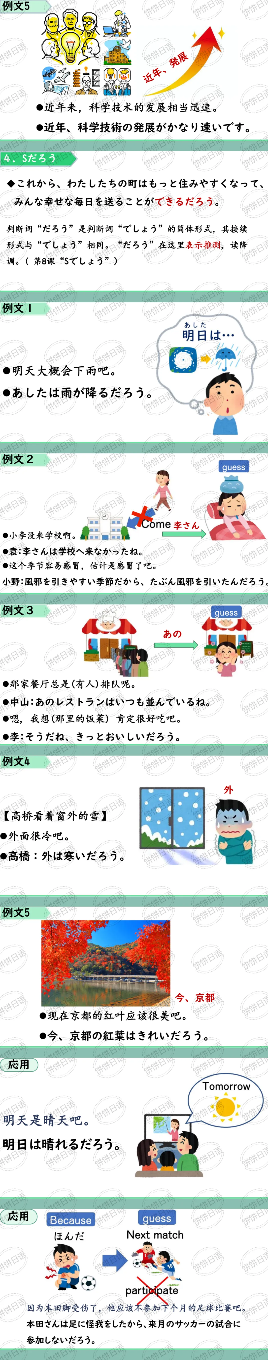 4. Sだろう 判断词“だろう”是判断词“でしょう”的简体形式,其接续形式与“でしょう”相同。“だろう”在这里表示推测,读降调。(第8课“Sでしょう”)