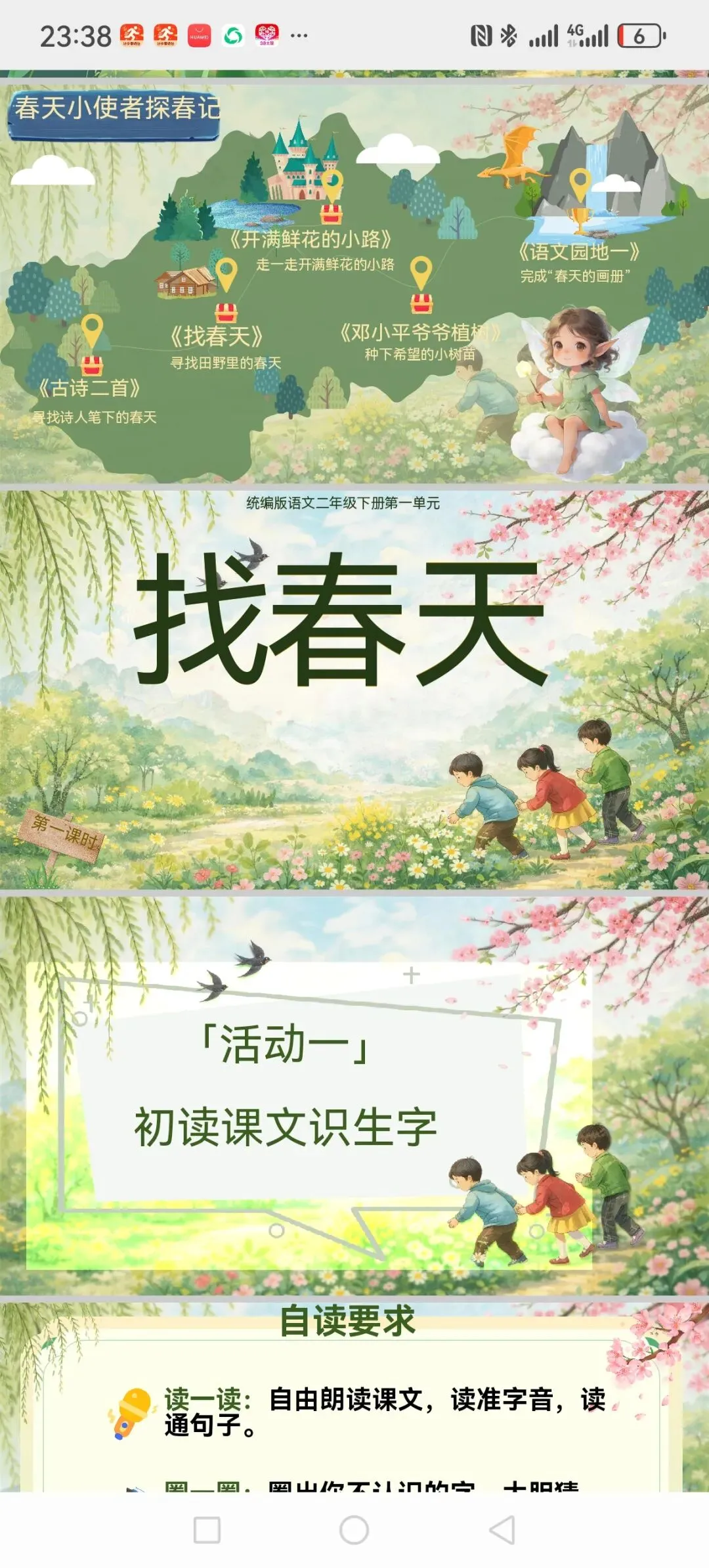 师:春天小使者们,要想找到春天,首先要把课文读正确、读流利。请大家自由朗读课文,读准字音,读通句子,圈出你不认识的字,大胆猜测读音。并标出自然段序号。