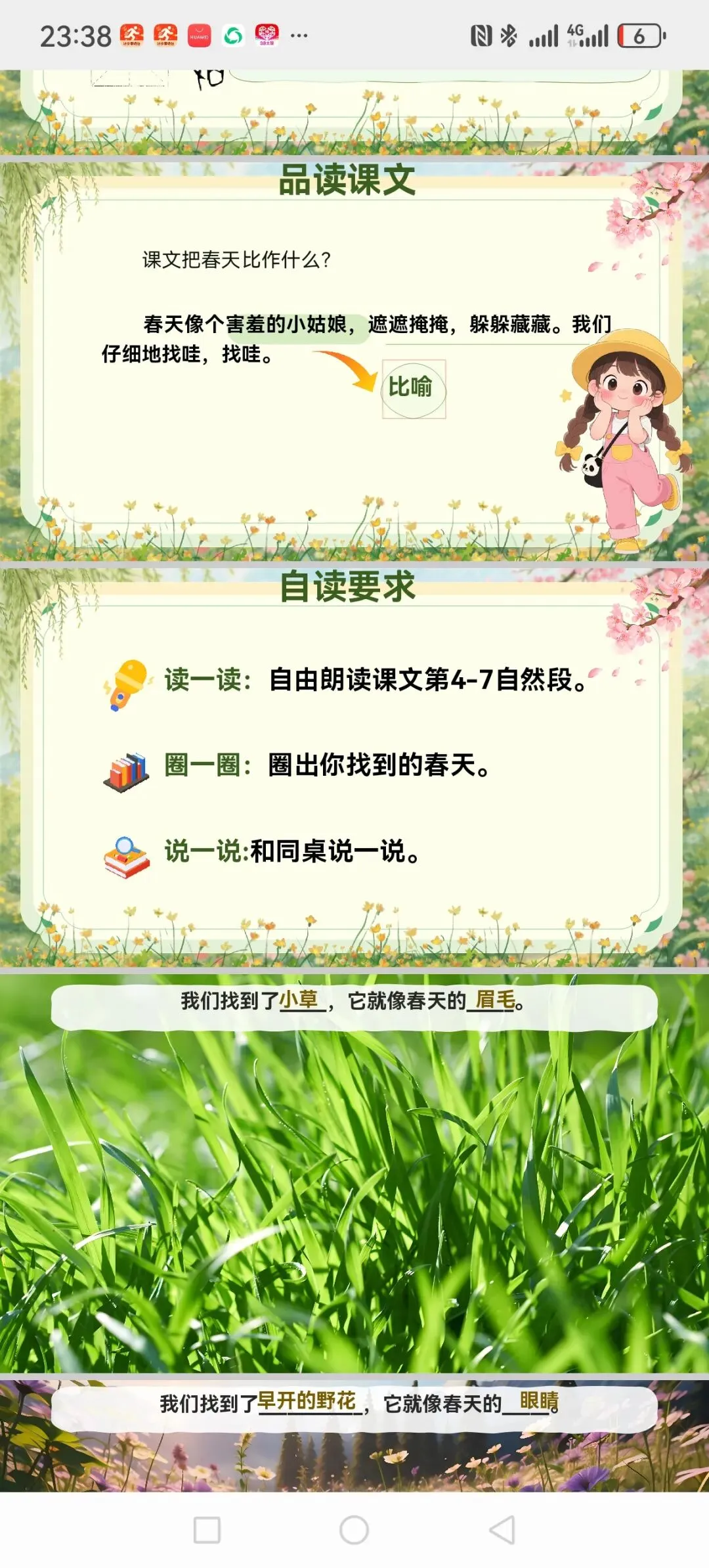 3.理解表达:能说出文中孩子们找到的春天是什么样的;能仿照第4-7自然段或第8自然段说一说自己发现的春天。