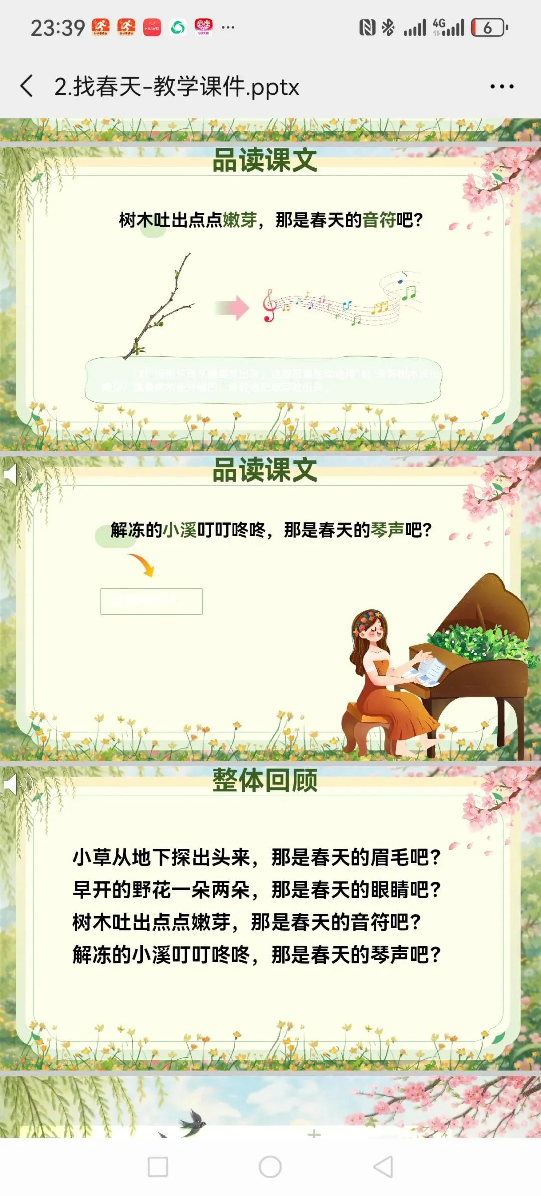 师:春天小使者们,今天我们完成了任务二——寻找田野里的春天。我们找到了春天的眉毛、眼睛、音符、琴声,还学会了用美丽的语言描写春天。