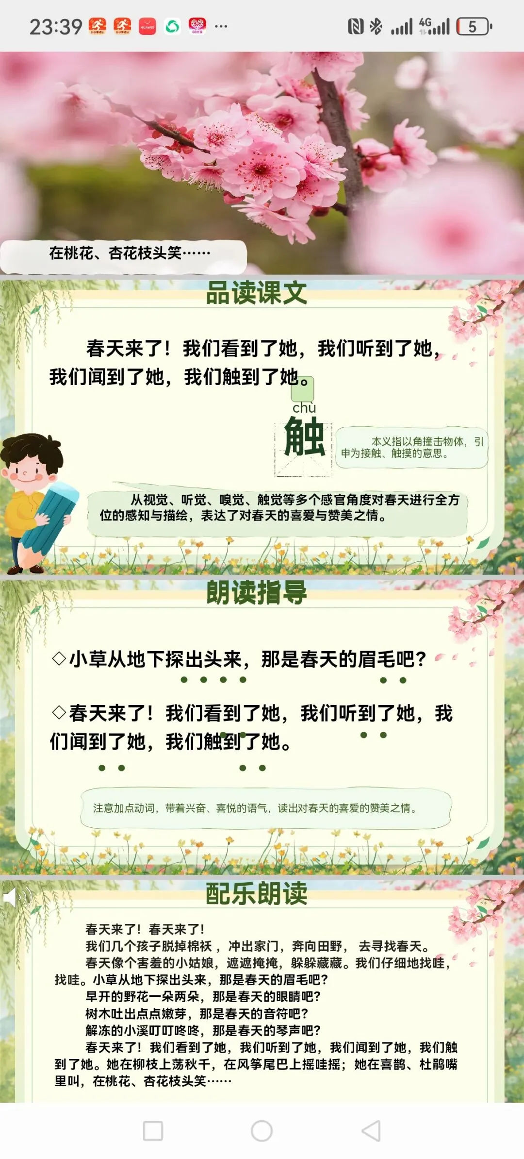 师:让我们配上音乐,把整篇课文美美地读一遍,感受春天的美好!