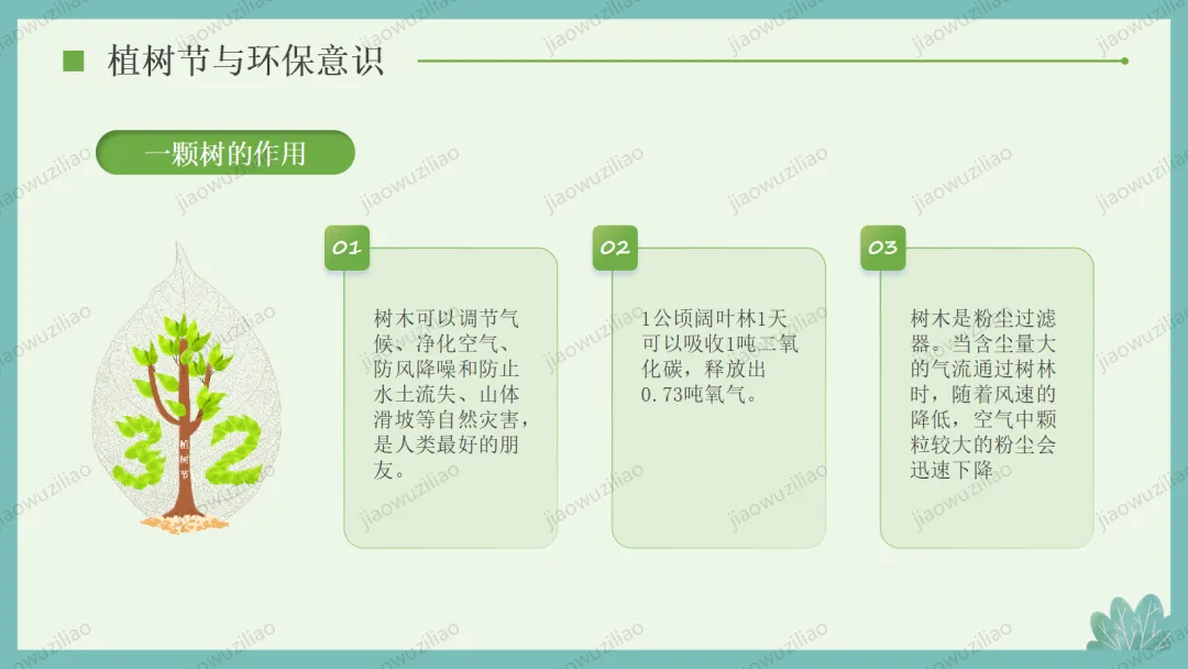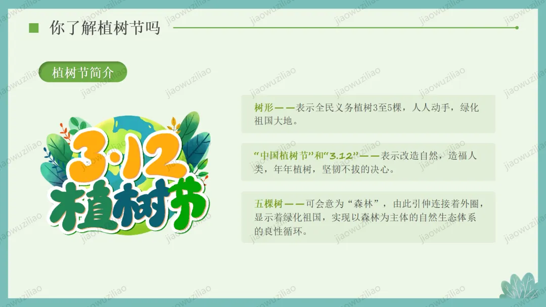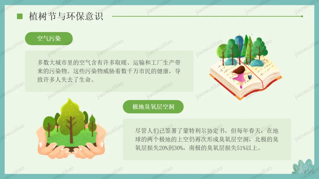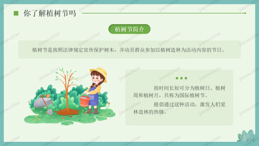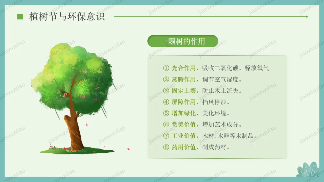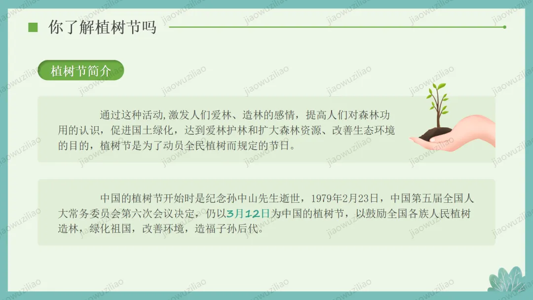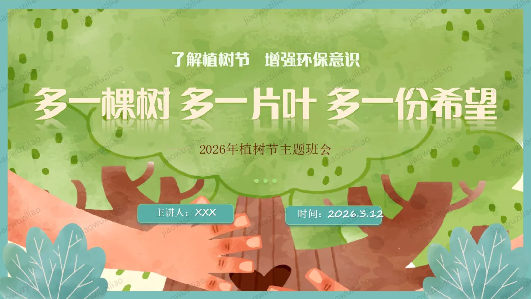 3 月 12 日是植树节,植树造林、爱护绿色是我们共同的责任。小树净化空气、美化环境,守护着我们的家园。让我们从身边做起,爱护花草树木,积极参与植树护绿,用行动为地球添一片新绿,争做环保小卫士,让绿色永远陪伴我们成长如果您对这篇课件感兴趣,文末有课件的获取方式(PPT无水印,可编辑修改)关注下方卡片公众号有偿获取。(关注后+小编好友,再发课件的编号【3084】或截图。)免责申明:此资料来源于网络公开资源,仅用于学习交流使用,售价为整理资料的费用,我们尊重原创,版权归原作者。,如果侵犯到您的权益,请第一时间联系我们,我们将立即更正或删除相关内容.