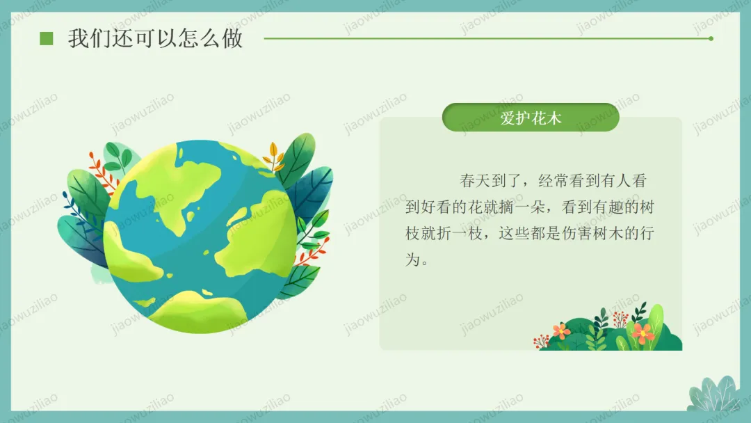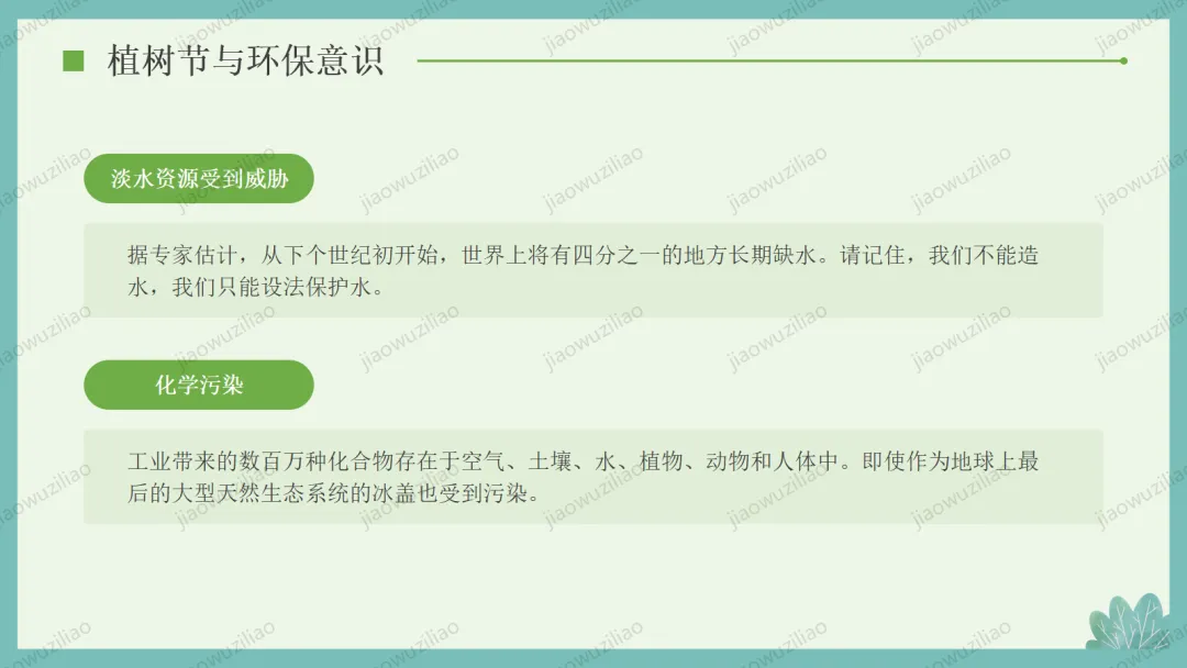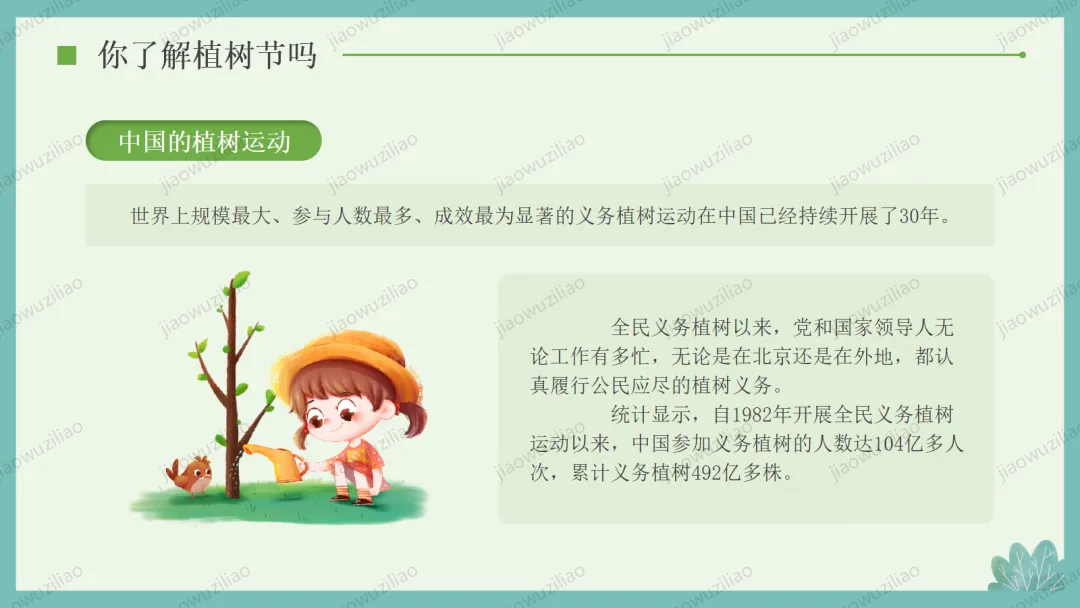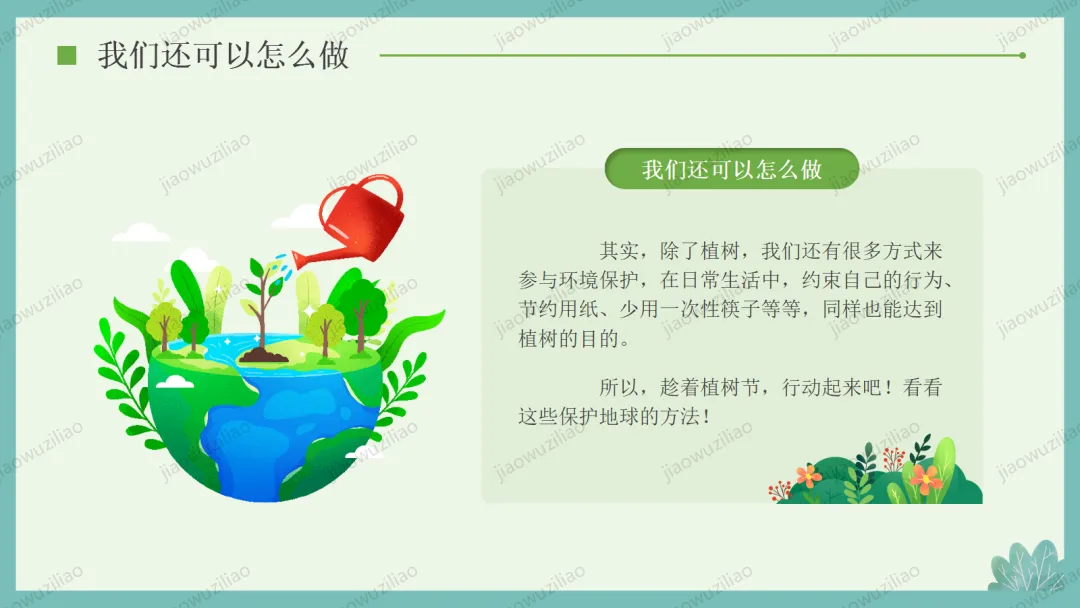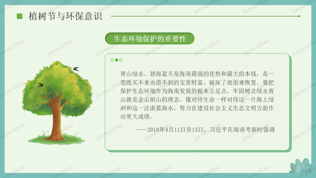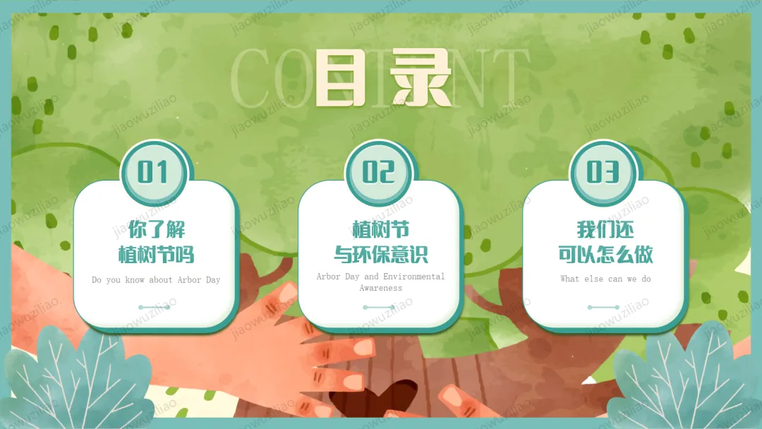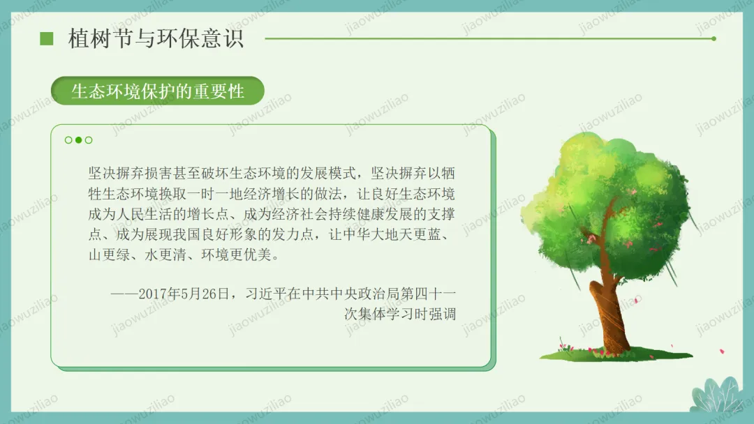 3 月 12 日是植树节,植树造林、爱护绿色是我们共同的责任。小树净化空气、美化环境,守护着我们的家园。让我们从身边做起,爱护花草树木,积极参与植树护绿,用行动为地球添一片新绿,争做环保小卫士,让绿色永远陪伴我们成长如果您对这篇课件感兴趣,文末有课件的获取方式(PPT无水印,可编辑修改)关注下方卡片公众号有偿获取。(关注后+小编好友,再发课件的编号【3084】或截图。)免责申明:此资料来源于网络公开资源,仅用于学习交流使用,售价为整理资料的费用,我们尊重原创,版权归原作者。,如果侵犯到您的权益,请第一时间联系我们,我们将立即更正或删除相关内容.