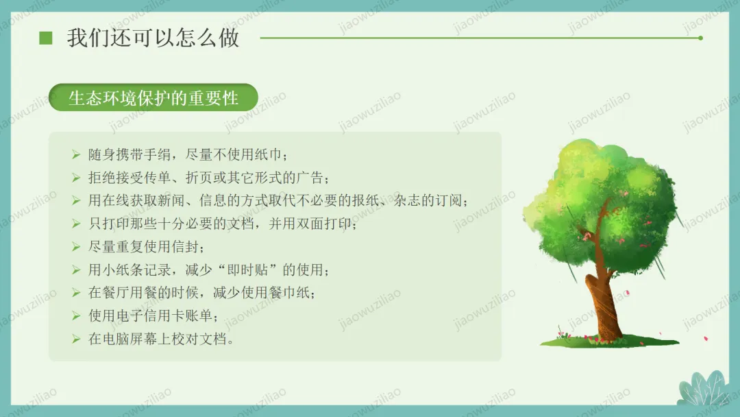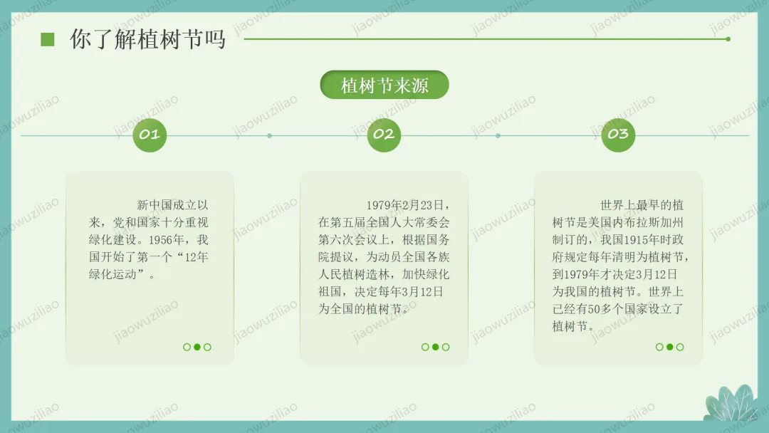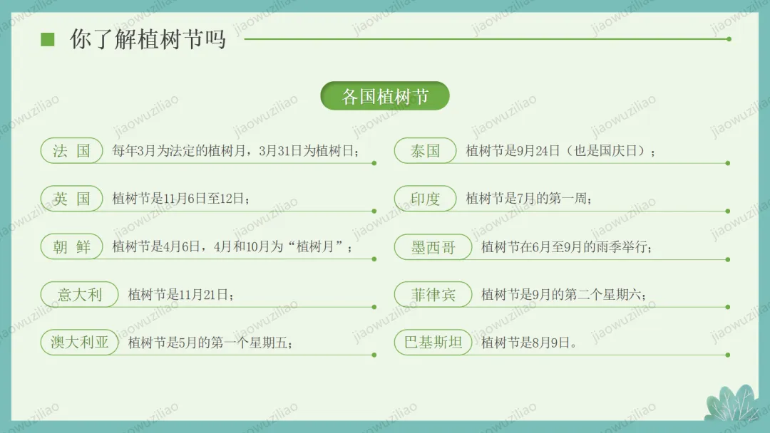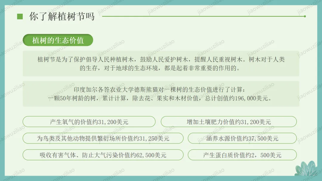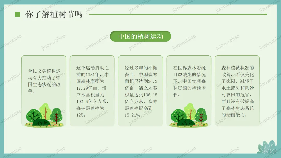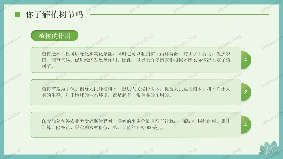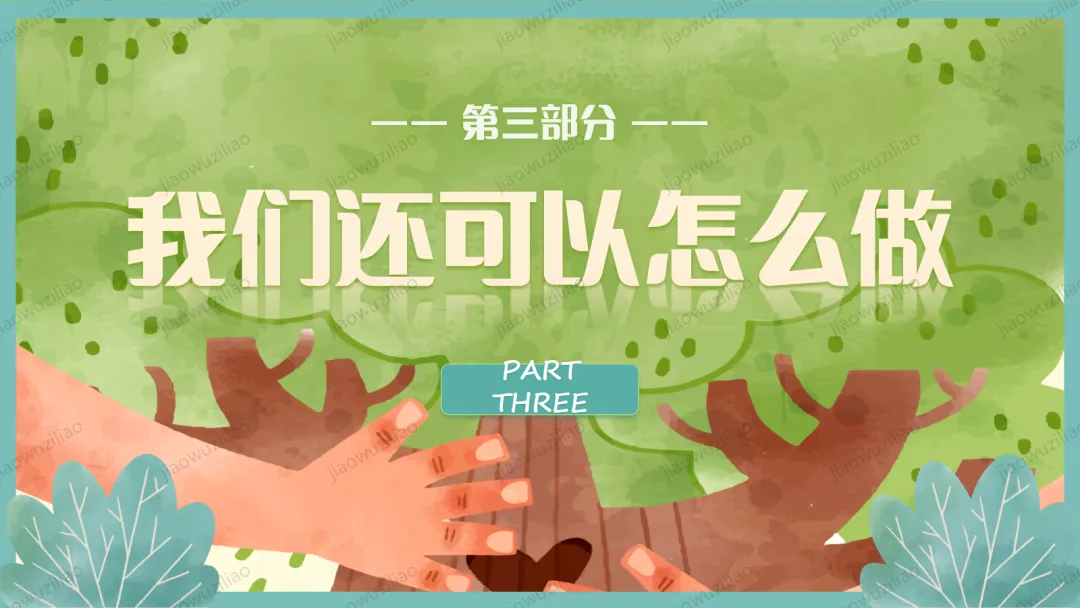 3 月 12 日是植树节,植树造林、爱护绿色是我们共同的责任。小树净化空气、美化环境,守护着我们的家园。让我们从身边做起,爱护花草树木,积极参与植树护绿,用行动为地球添一片新绿,争做环保小卫士,让绿色永远陪伴我们成长如果您对这篇课件感兴趣,文末有课件的获取方式(PPT无水印,可编辑修改)关注下方卡片公众号有偿获取。(关注后+小编好友,再发课件的编号【3084】或截图。)免责申明:此资料来源于网络公开资源,仅用于学习交流使用,售价为整理资料的费用,我们尊重原创,版权归原作者。,如果侵犯到您的权益,请第一时间联系我们,我们将立即更正或删除相关内容.